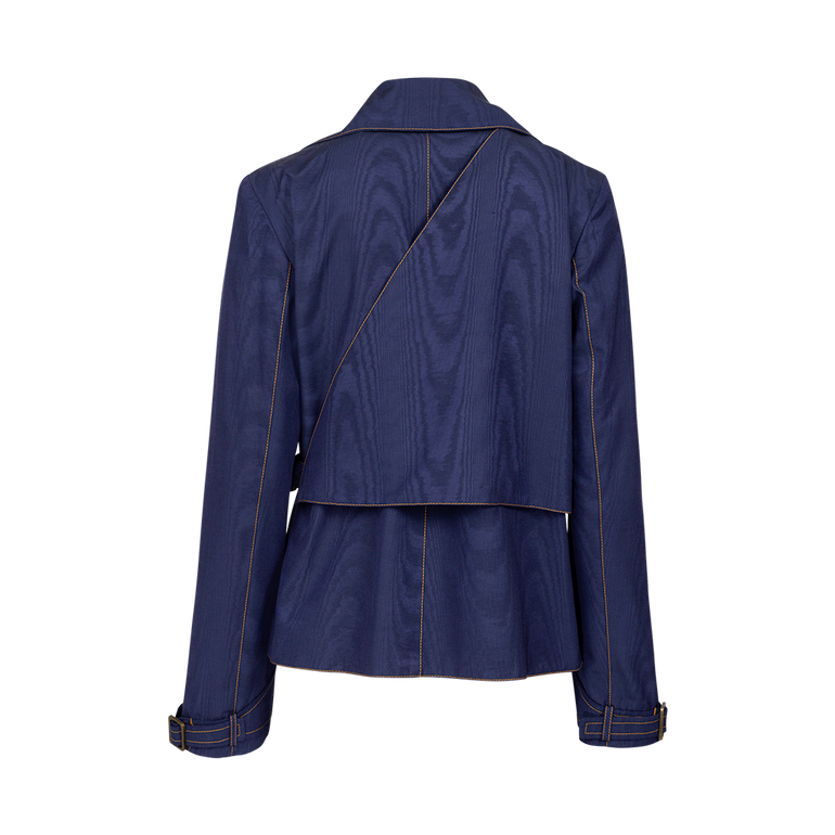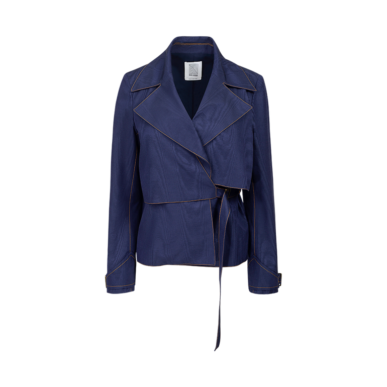 Jacket with asymmetrical wrap front, bold lapel, architectural lines and cropped silhouette.