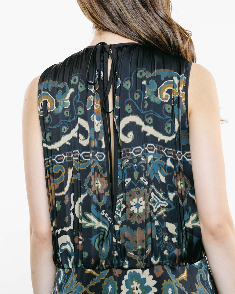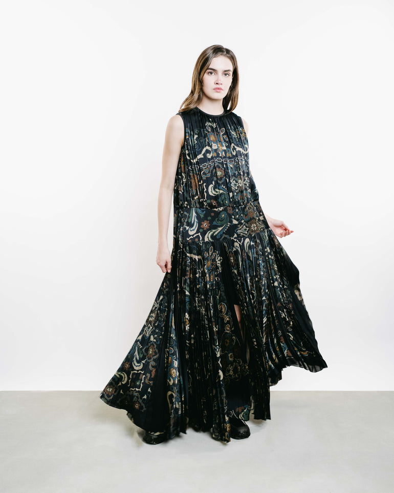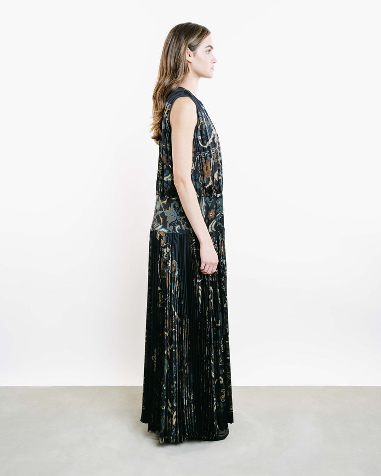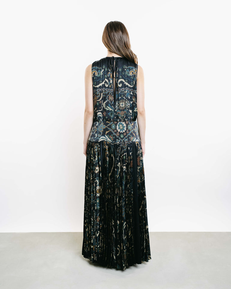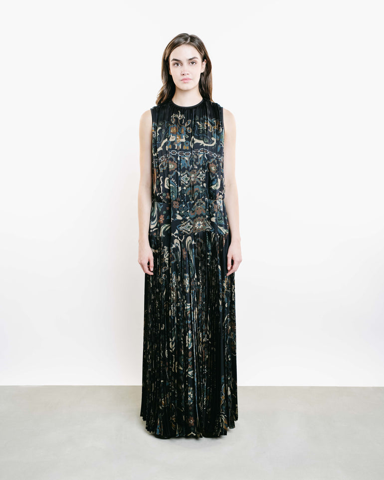 Sleeveless maxi dress with jewel neckline, gathered bodice and plissé skirt.
