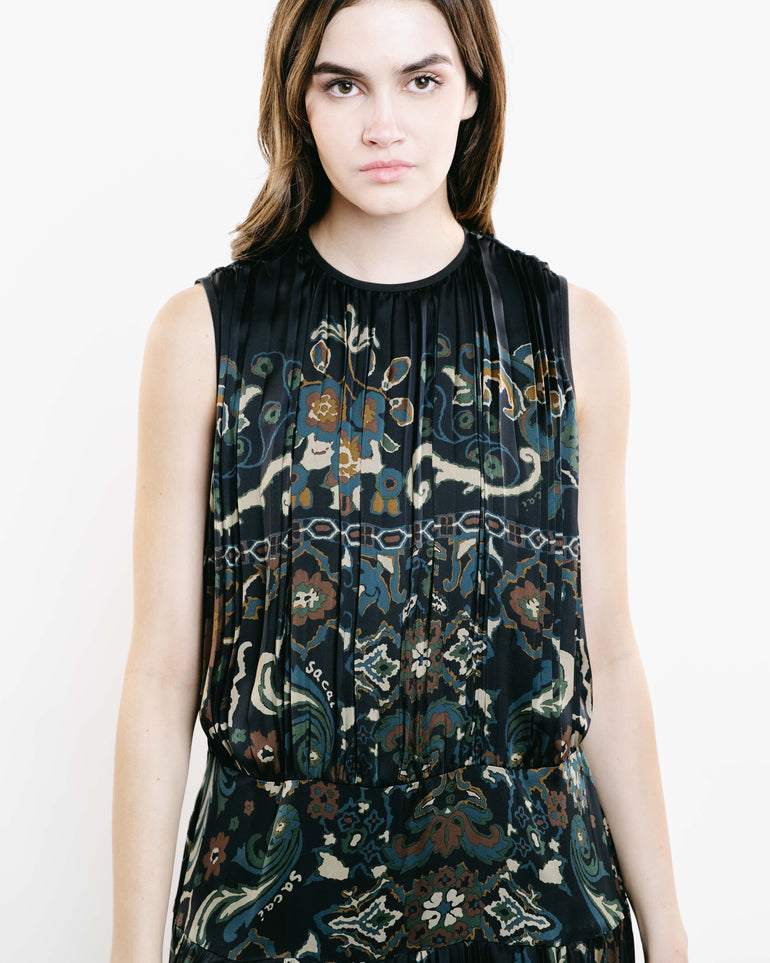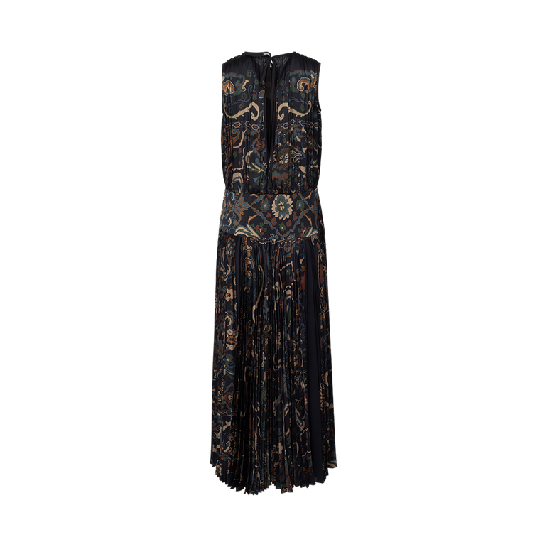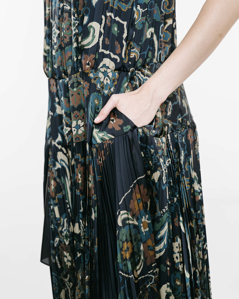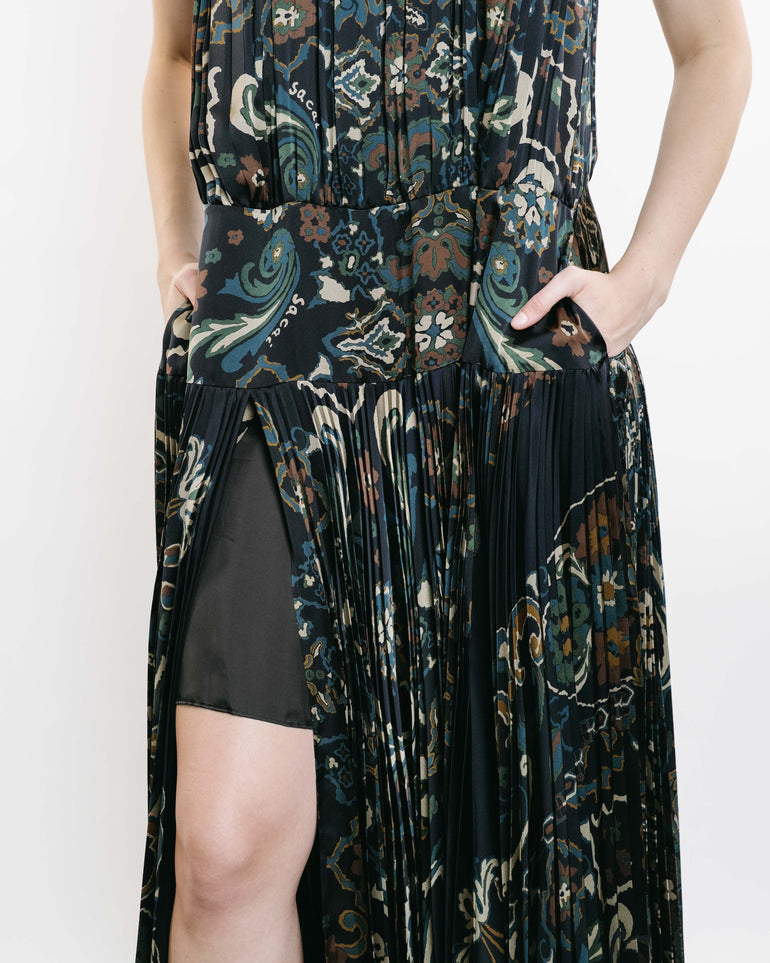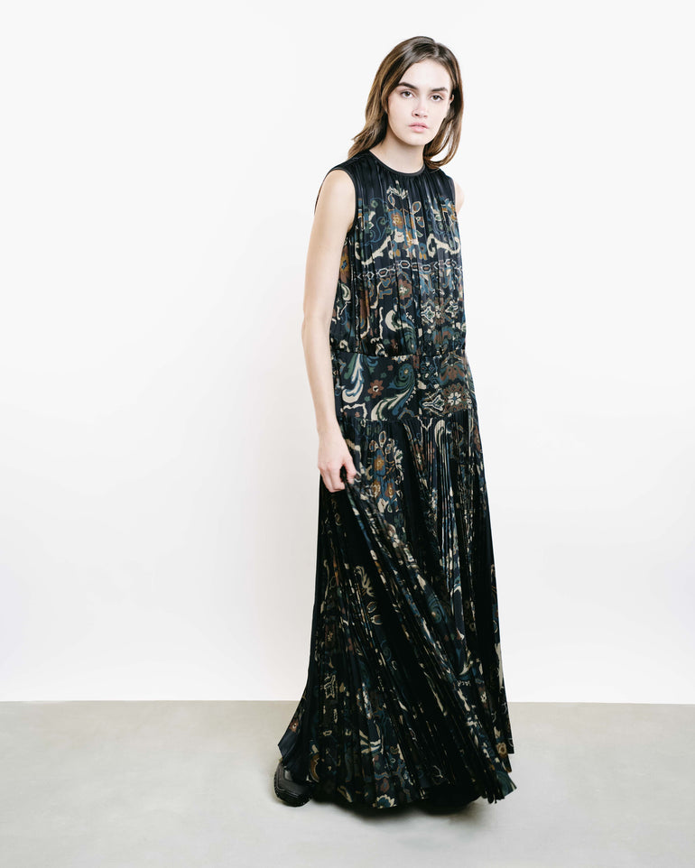 Sleeveless maxi dress with jewel neckline, gathered bodice and plissé skirt.
