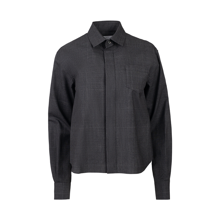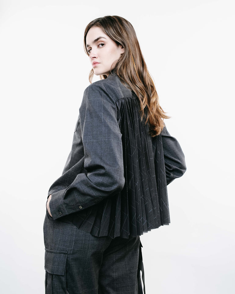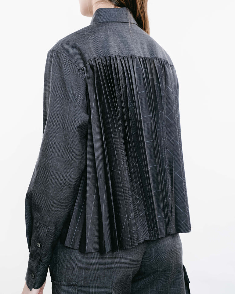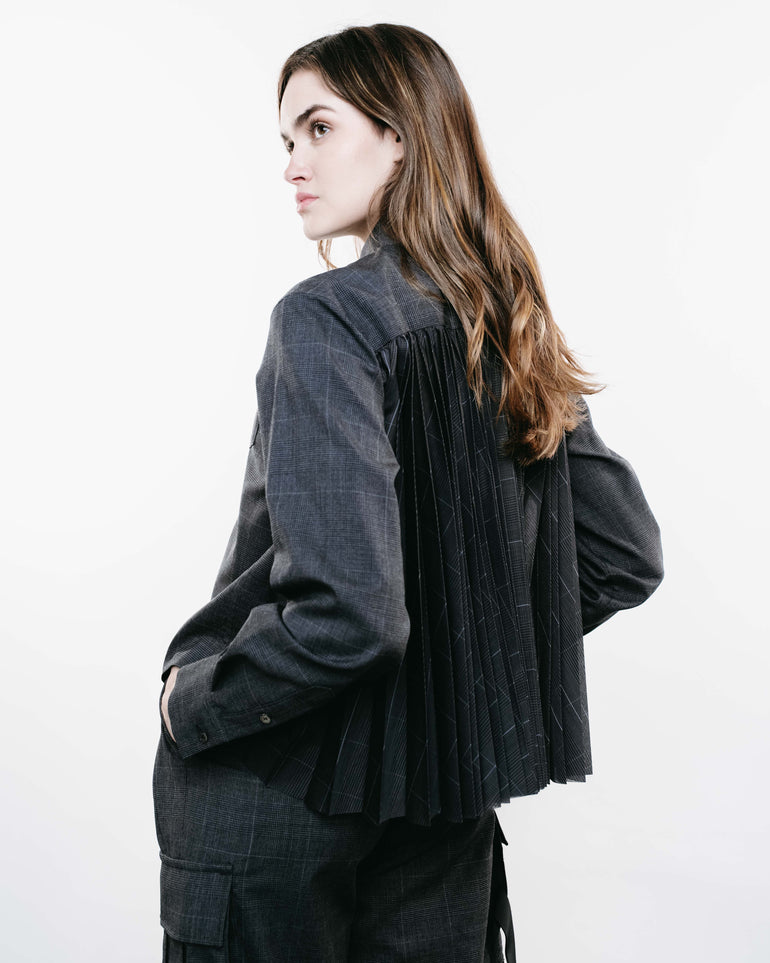 Shirt with spread collar, chest patch pockets, hidden-button placket and sharply pleated back panel.