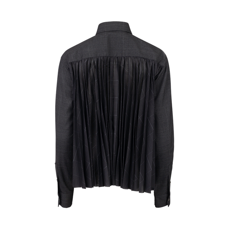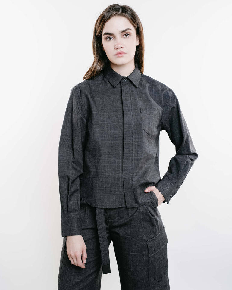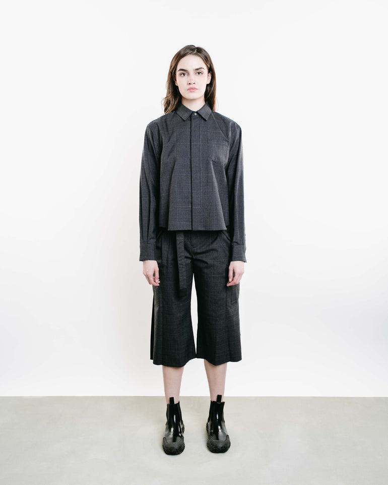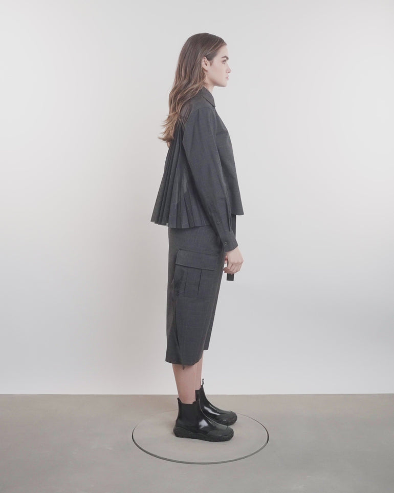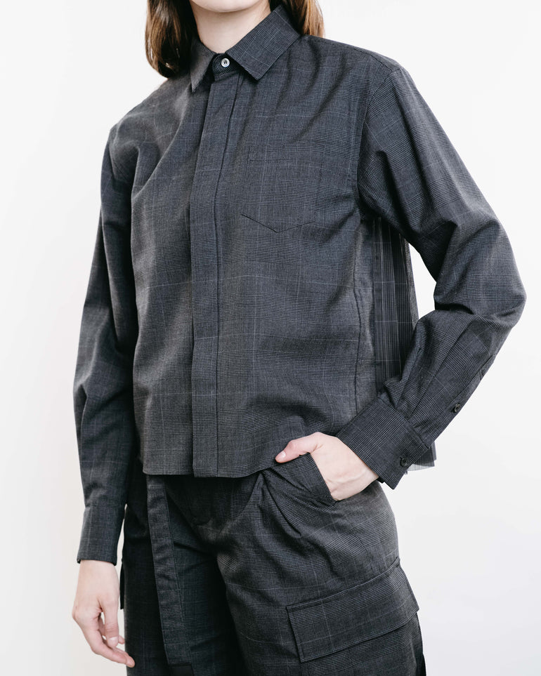 Shirt with spread collar, chest patch pockets, hidden-button placket and sharply pleated back panel.