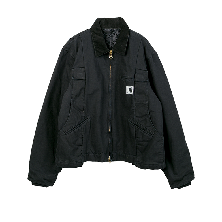 Jacket with spread collar neckline, two chest pockets, front zip and two side pockets at front.