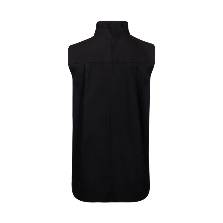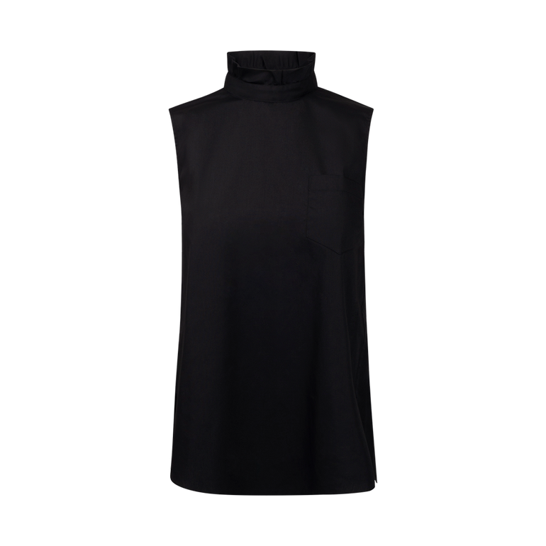 Sleeveless top with gathering at mock neckline, patch pocket, tennis-tail hem and press-stud closure at back collar.