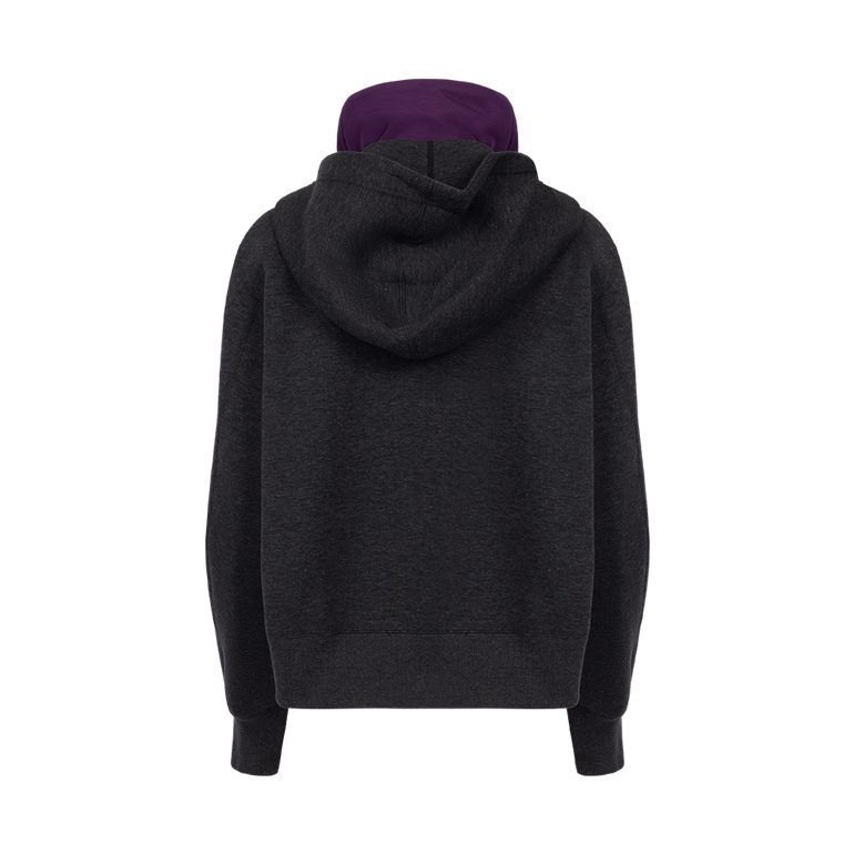 Layered zip hoodie with mock turtleneck, drop shoulders and front zip closure with snap placket.