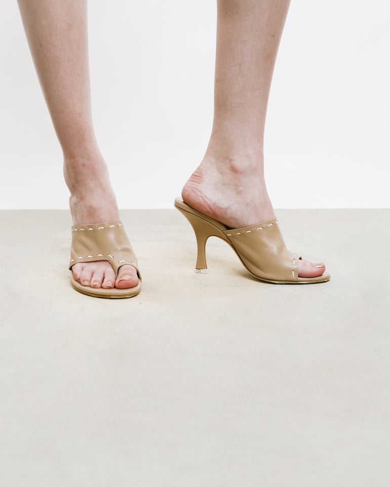 Sandals with wide vamp, thong toe strap, stitching detail and flared heel.