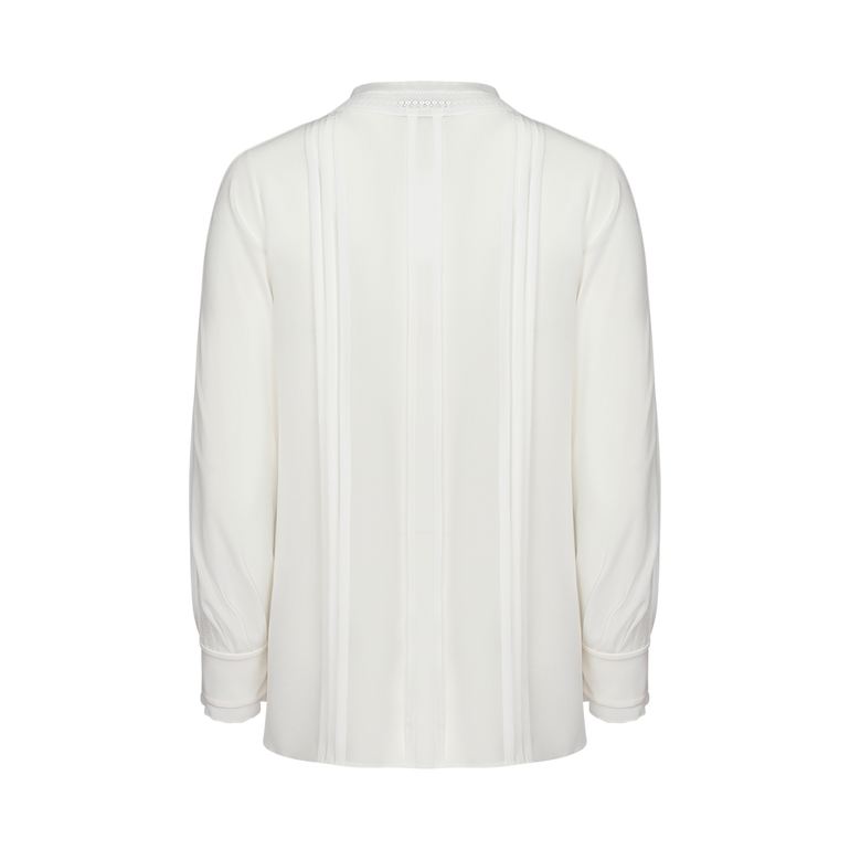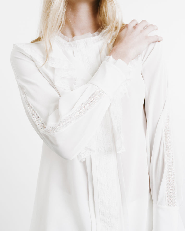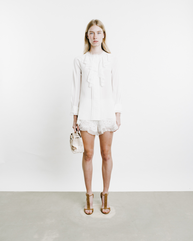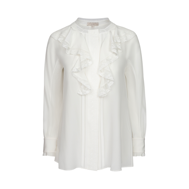 Long-sleeved shirt with ruffle embellishments at front placket.