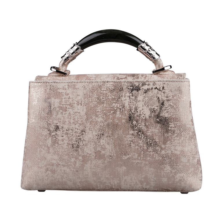 Handbag with rounded jade top handle and shoulder strap. Approx. 9"W x 6"H x 3.5"D.
