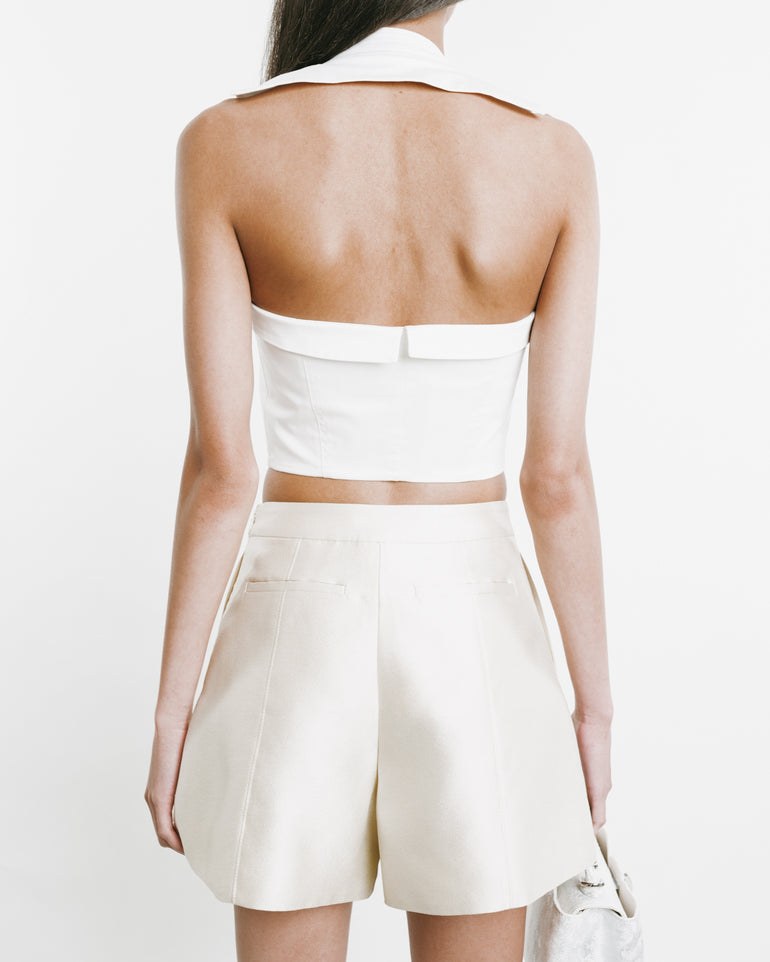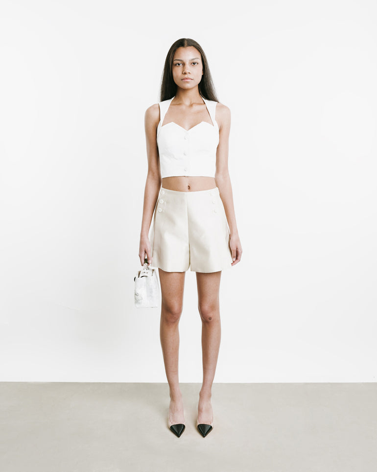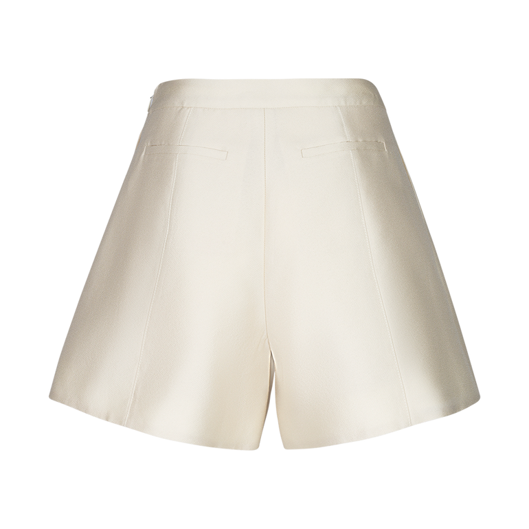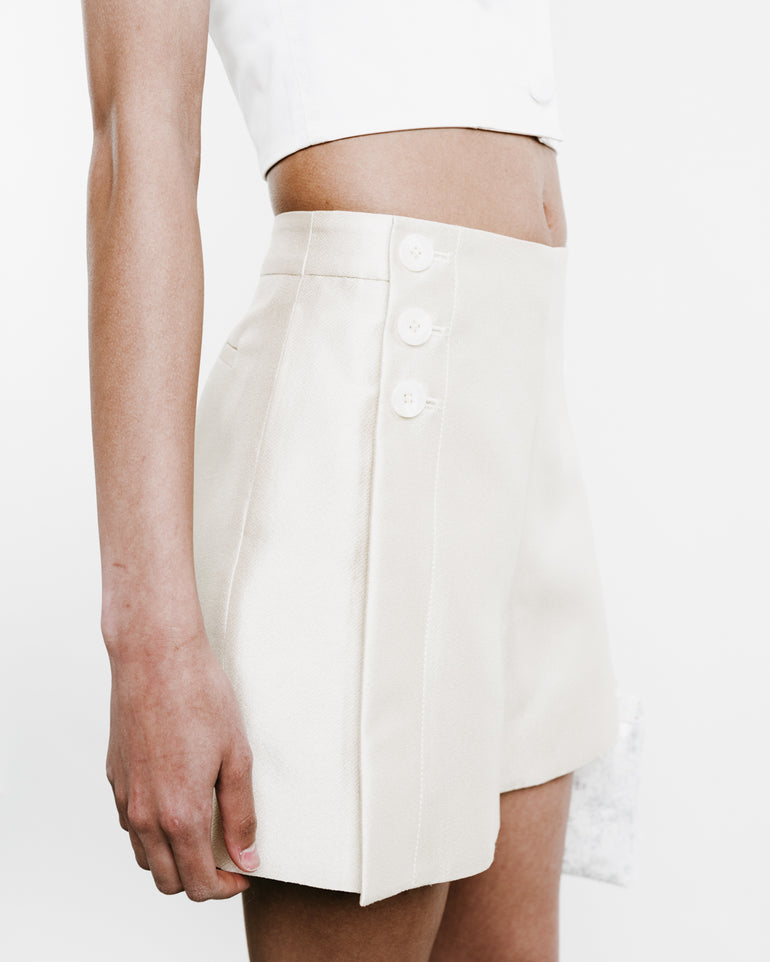Shorts with side-button detail, side zip closure and back slit pockets.