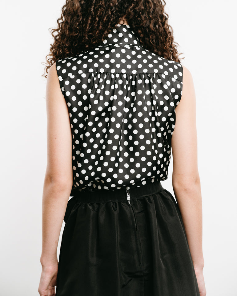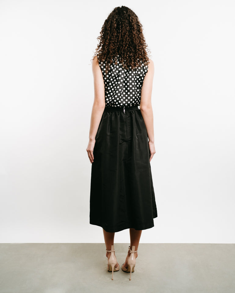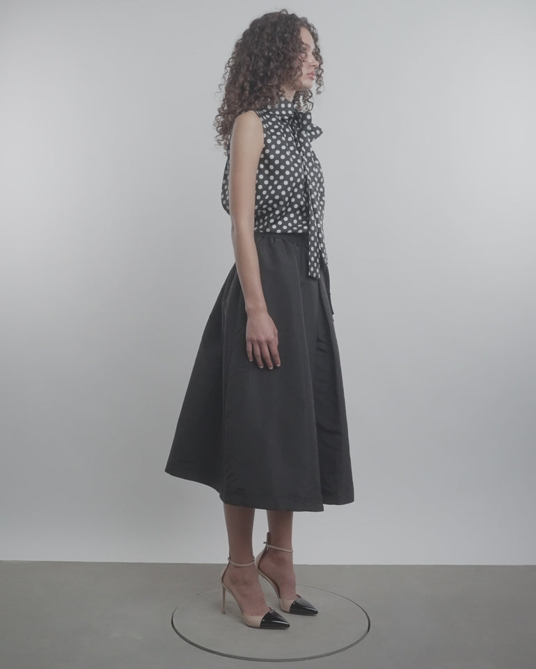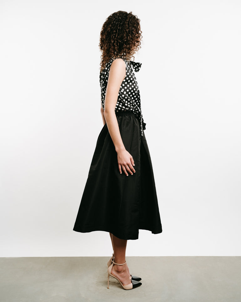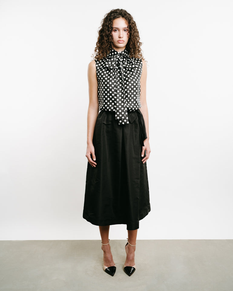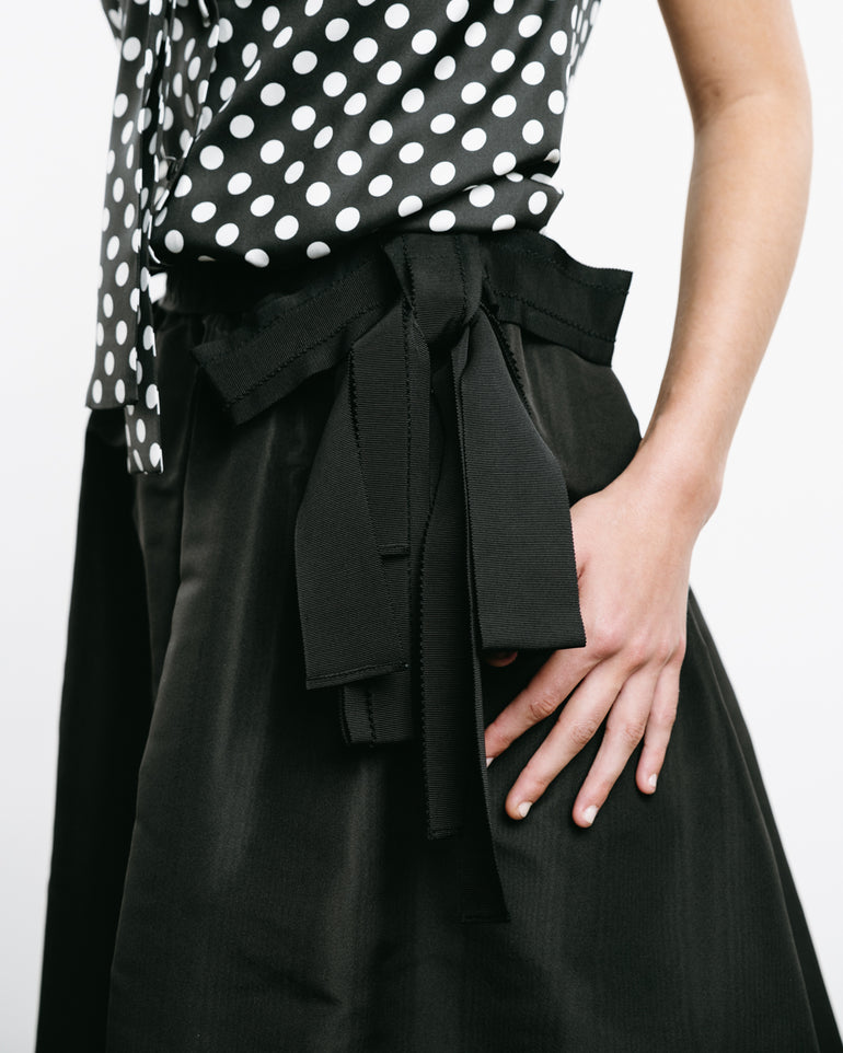 High-waisted midi skirt with gathered volume, bow detail at waist and soft pleating throughout.