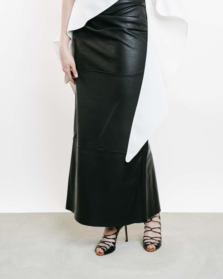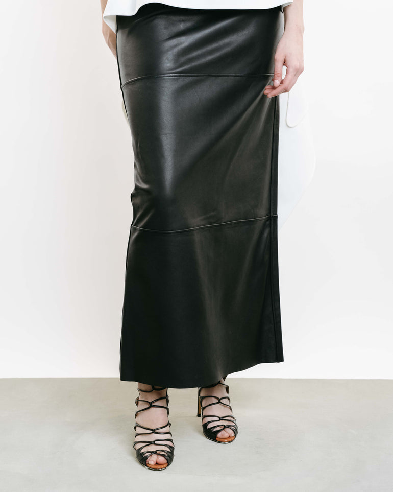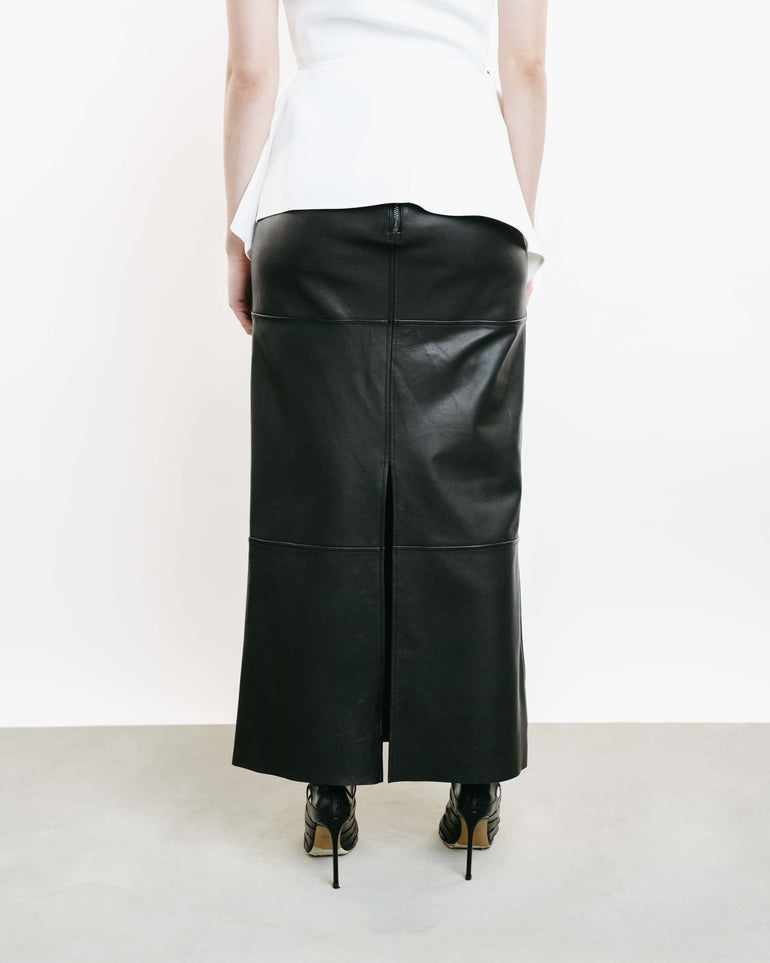Midi skirt in pencil silhouette with gathered waist, tailored panels, center back split and back zip.