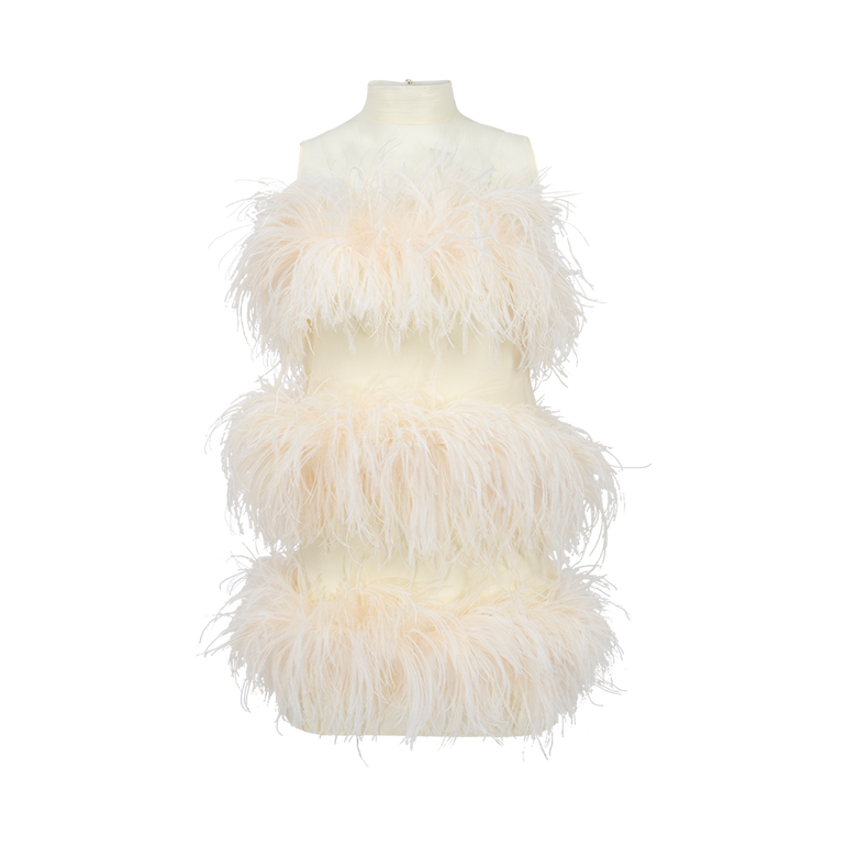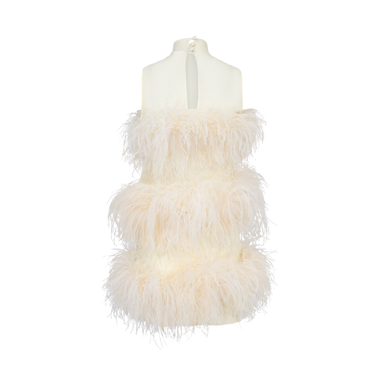 Sleeveless minidress with feather detailing, mock neckline, low back and straight fit.