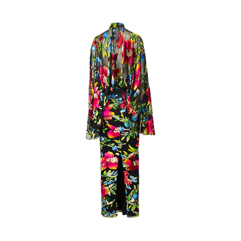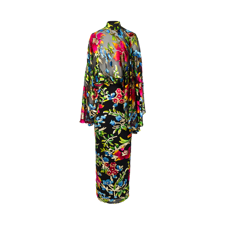 Gown with soft stand collar, blouson top, wide, flowing sleeves and floor-length hem. Lined.