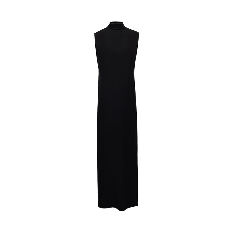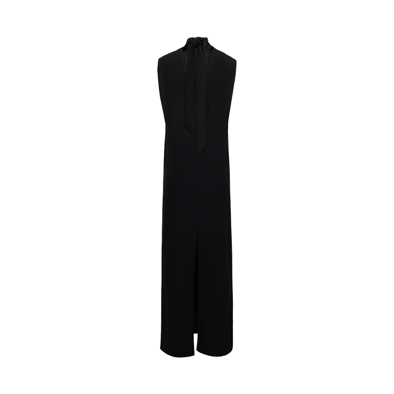 Sleeveless maxi dress with draped wrap-around tie detailing.