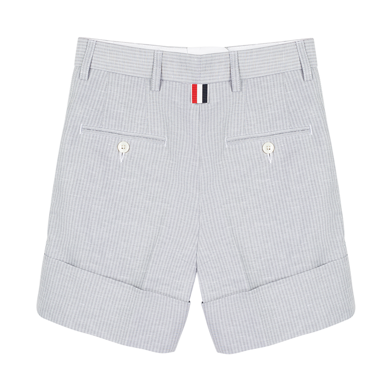 Tab-closure shorts with flat front, creased legs, and wide cuffs. Slant side pockets and button-fastening back welt pockets. Signature striped grosgrain loop tab at back waist.