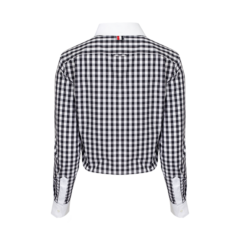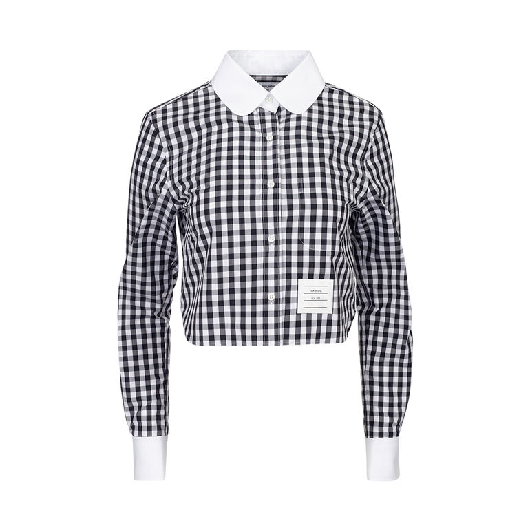 Shirt with Peter Pan collar, long sleeves, button front and cropped hem.