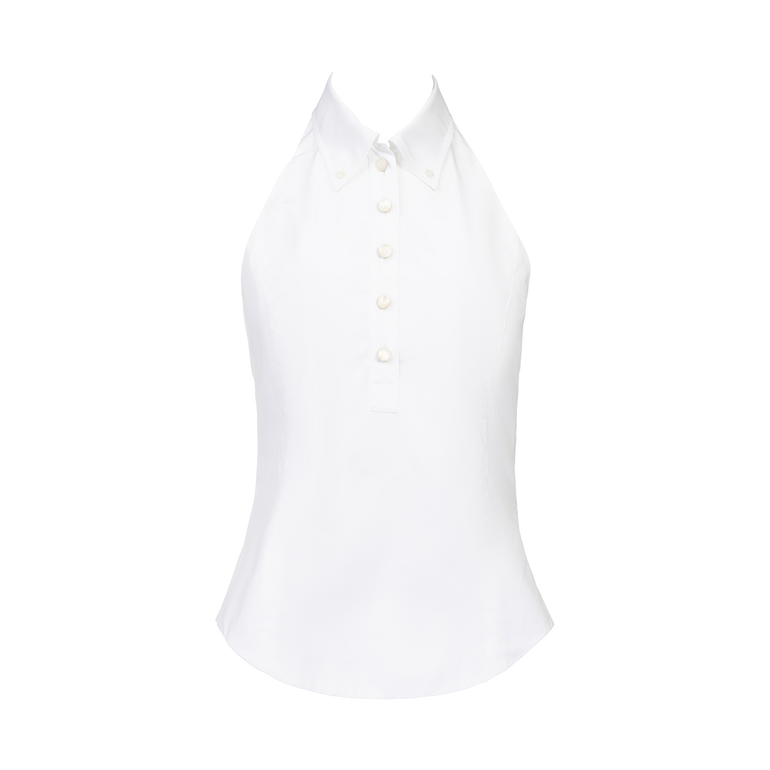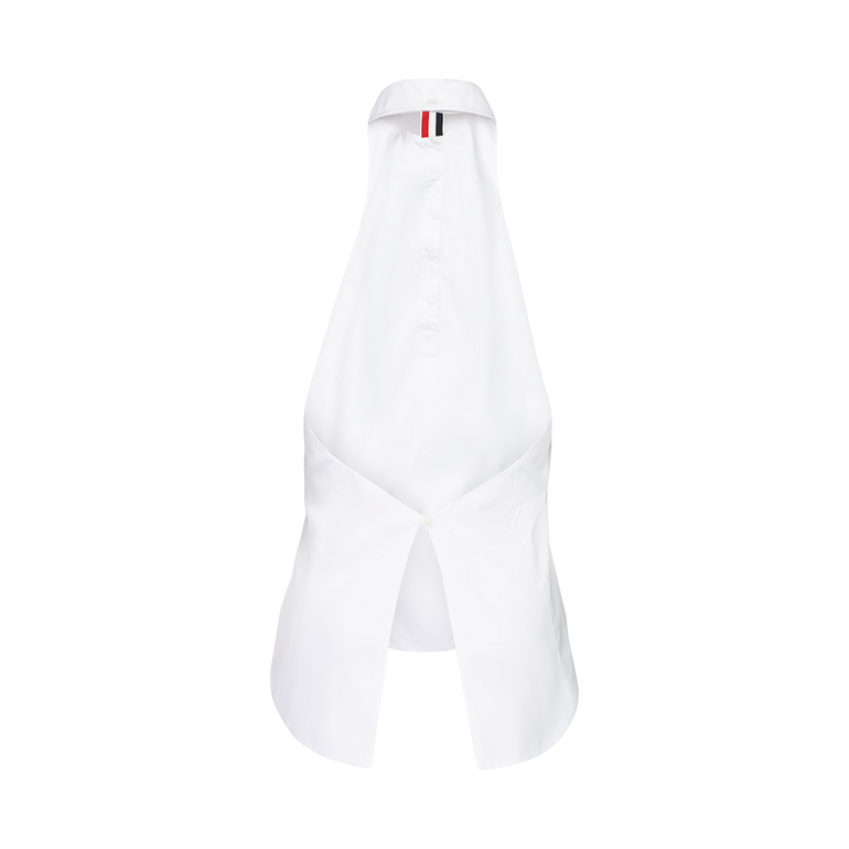 Button-down spread collar with fixed halter strap. Five-button placket and curved hem. Tricolor grosgrain flag at back collar. Button fastening at open back with central vent at hem.