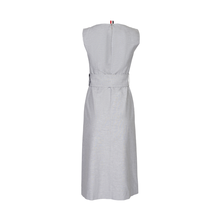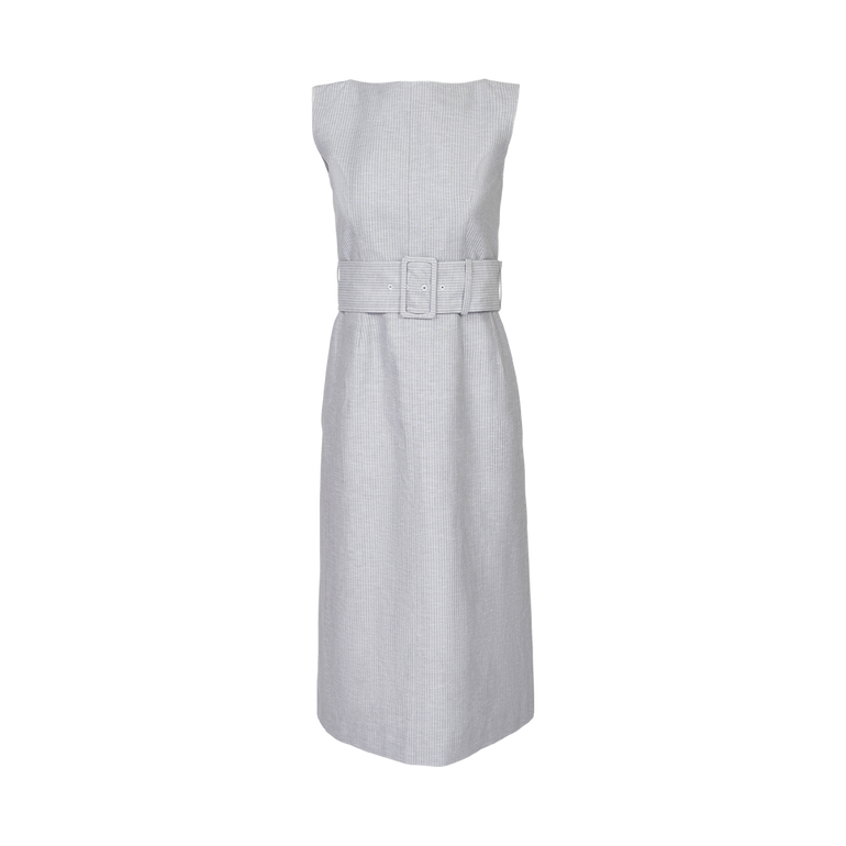 Sleeveless midi dress with boat neckline, wide belt and center back zip.