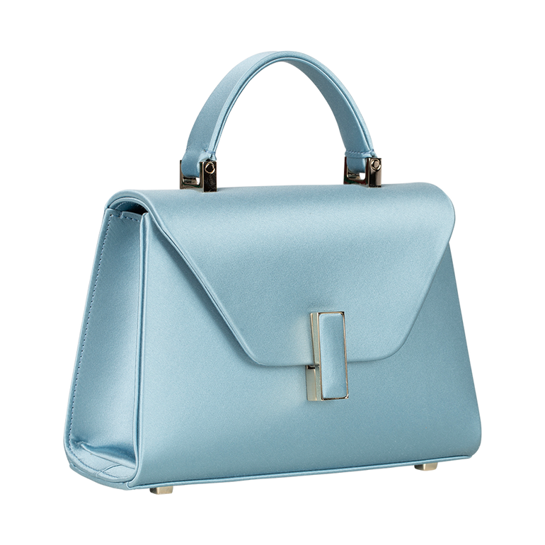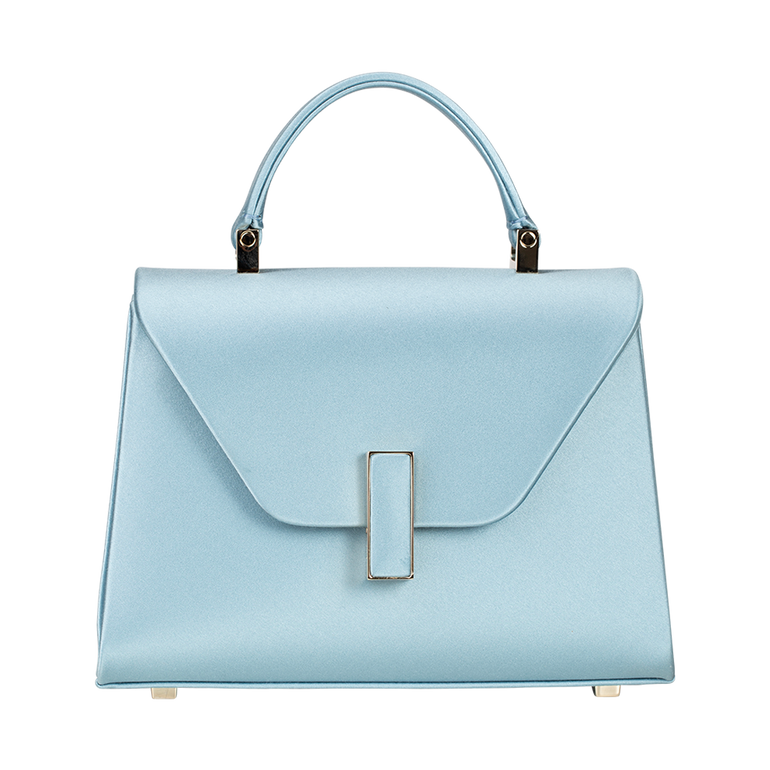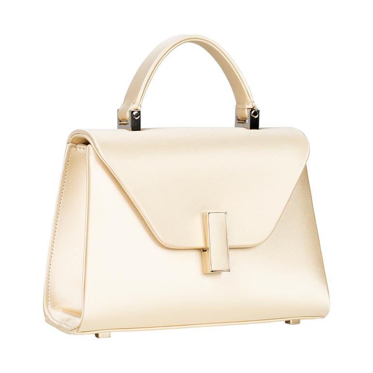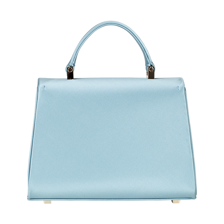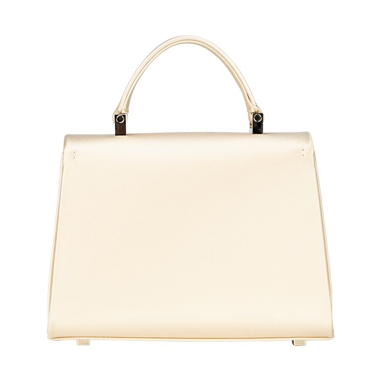 Satin handbag with detachable/adjustable gold chain shoulder strap, envelope flap top with turn-lock closure and one interior slip pocket. Approx. 5.5"H x 7.7"W x 3.7"D.