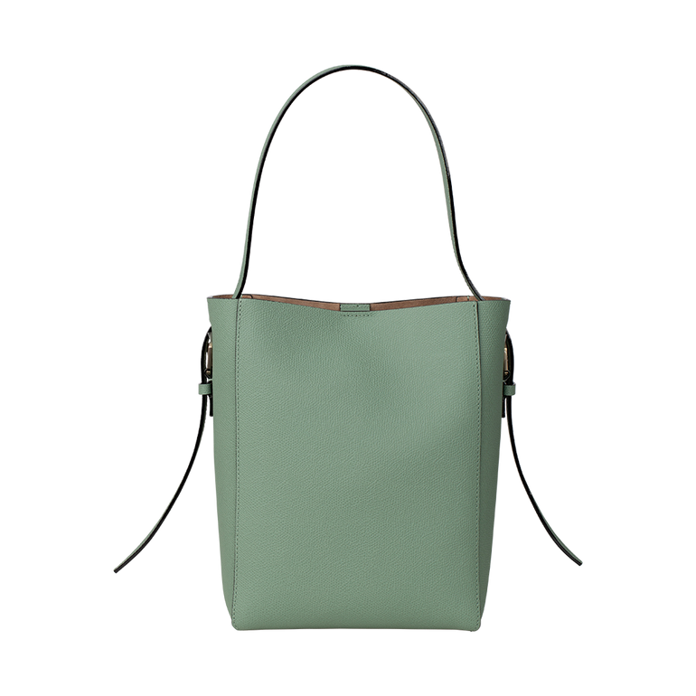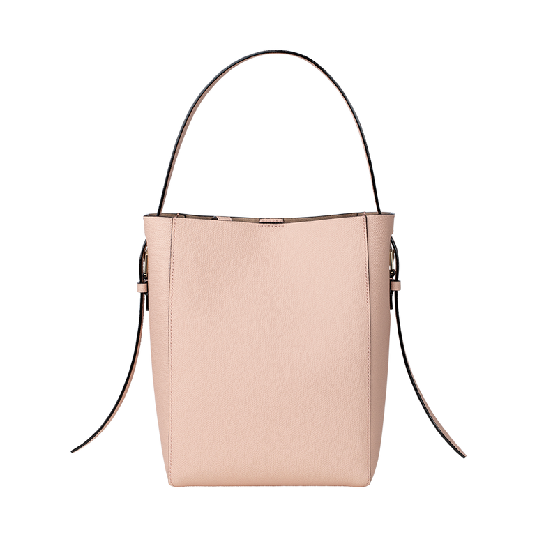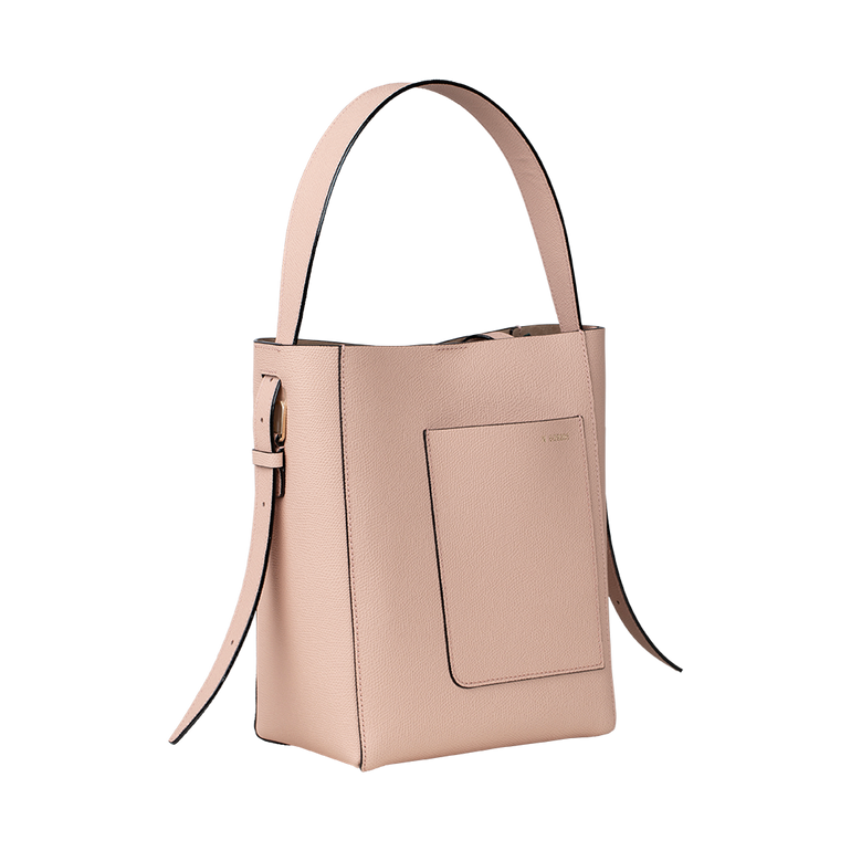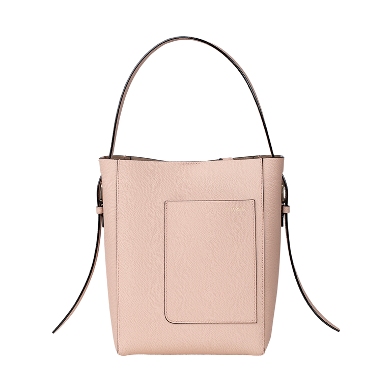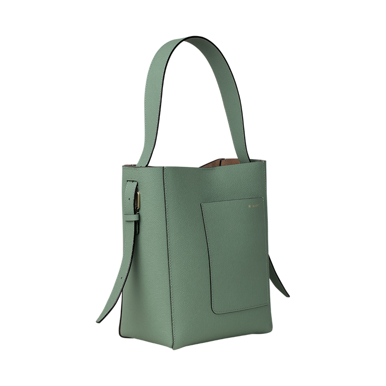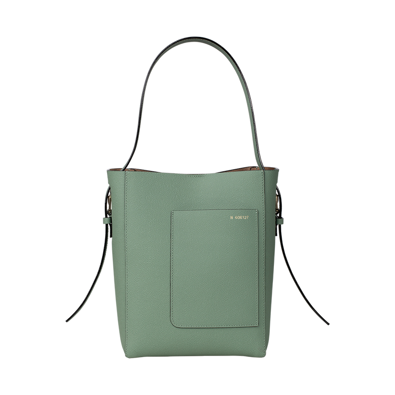 Bucket bag with adjustable strap, exterior pocket stamped with serial number and interior zipped pouch. Approx. 4.7"D x 9.8"H x 7.5"D.