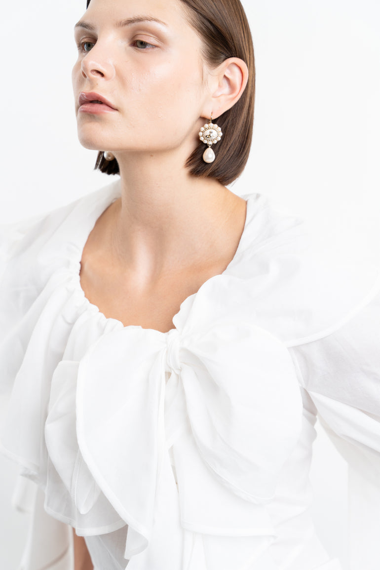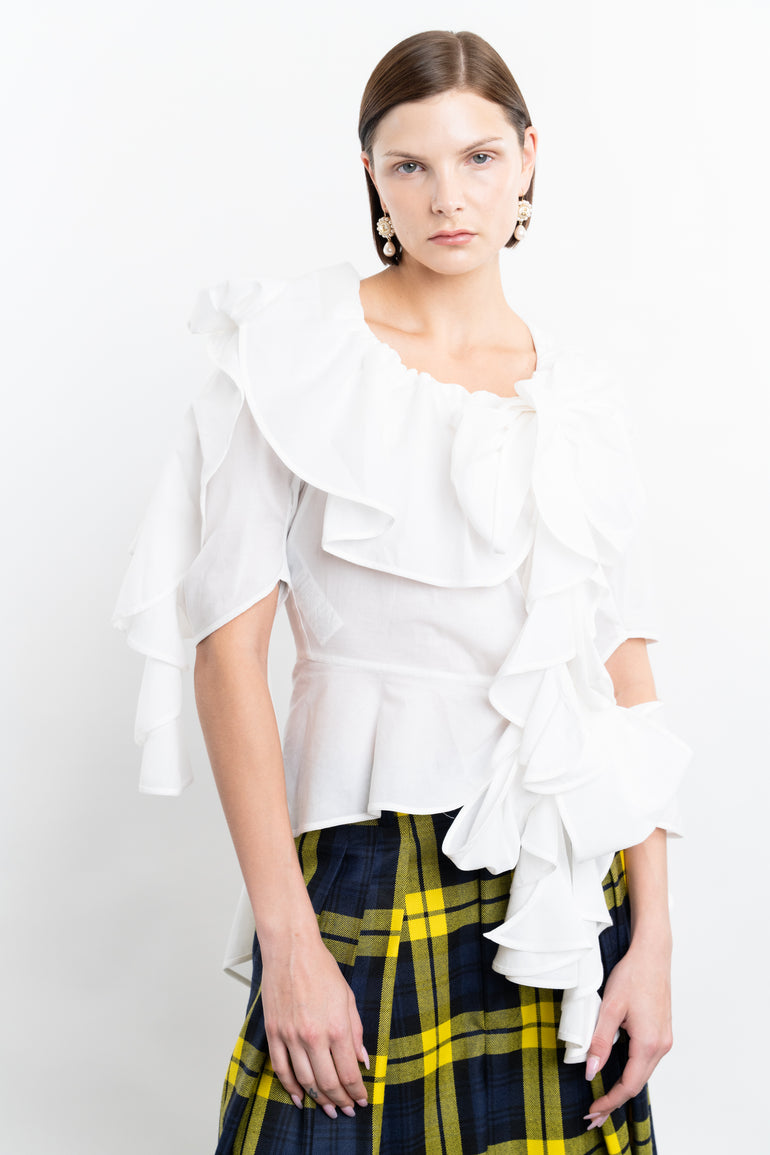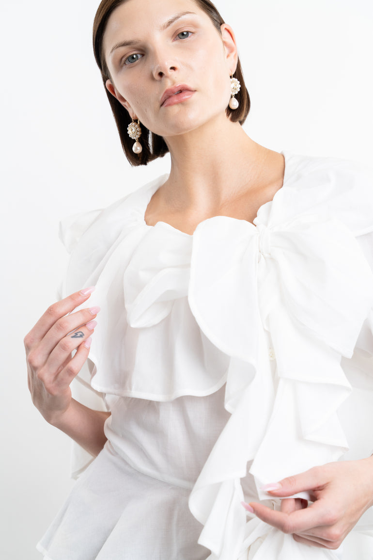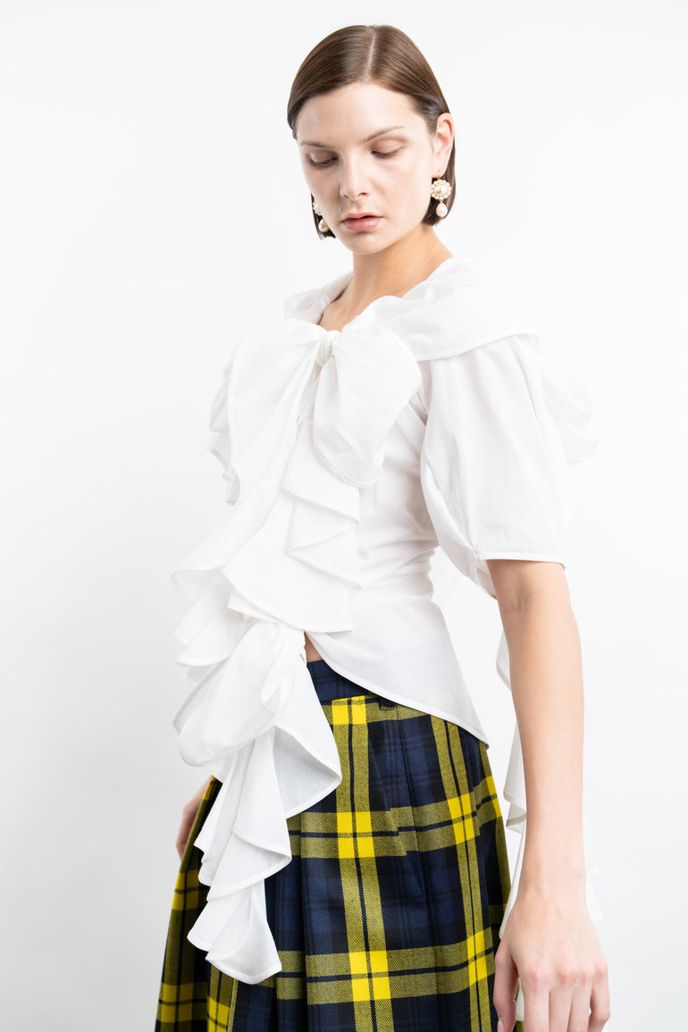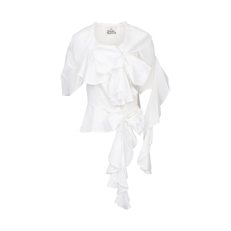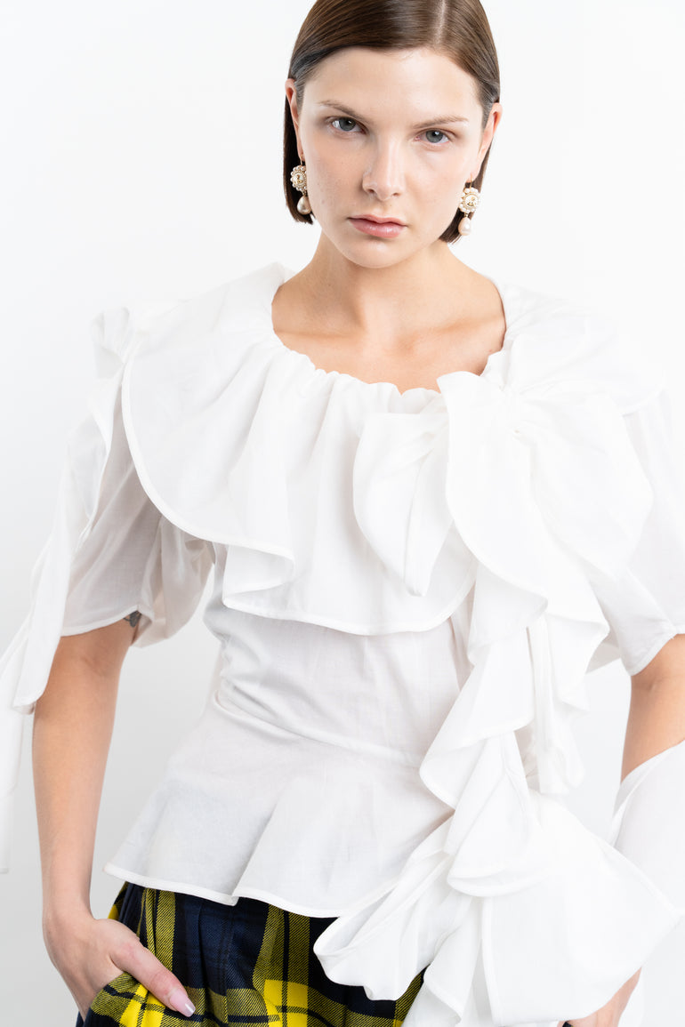 Draped top with asymmetric neckline, oversized bow detail, peplum hem and ruching detailing.