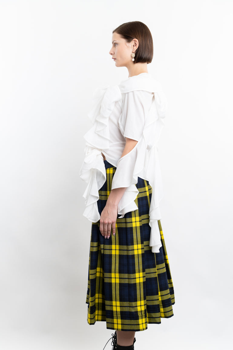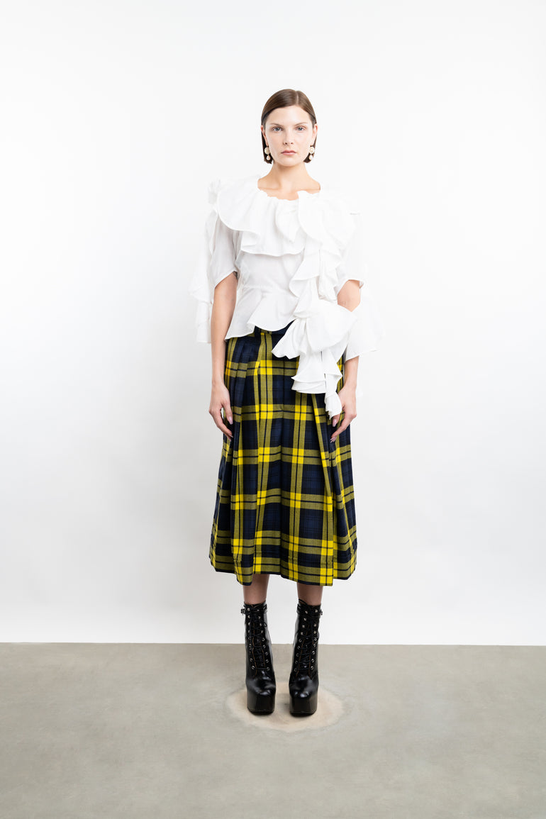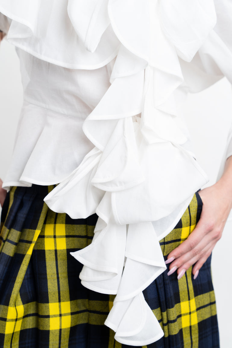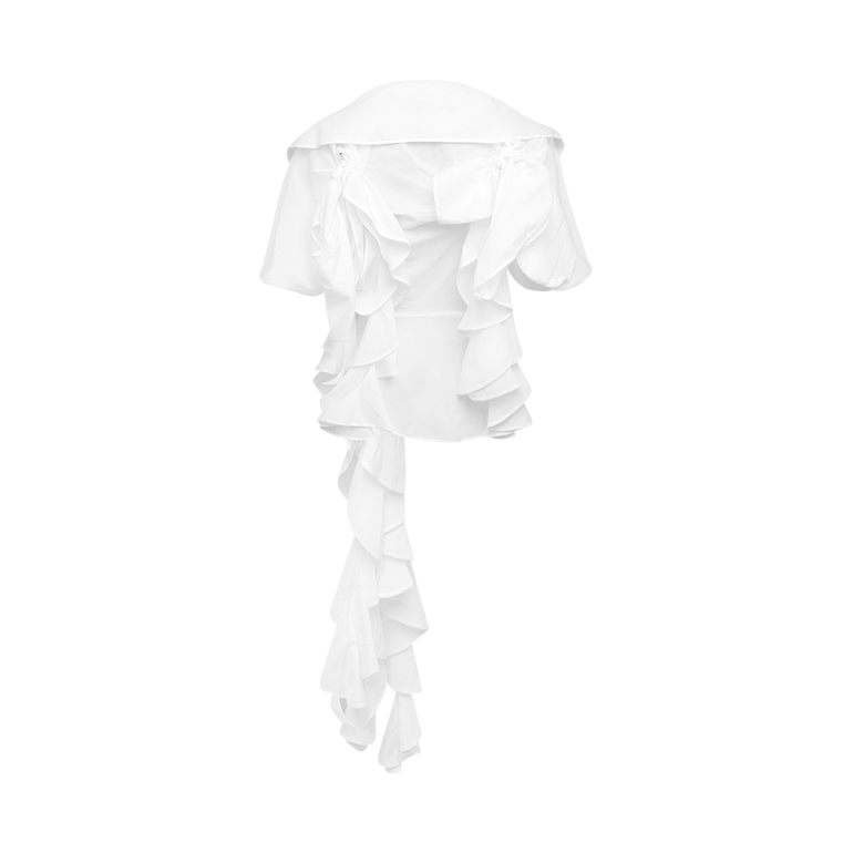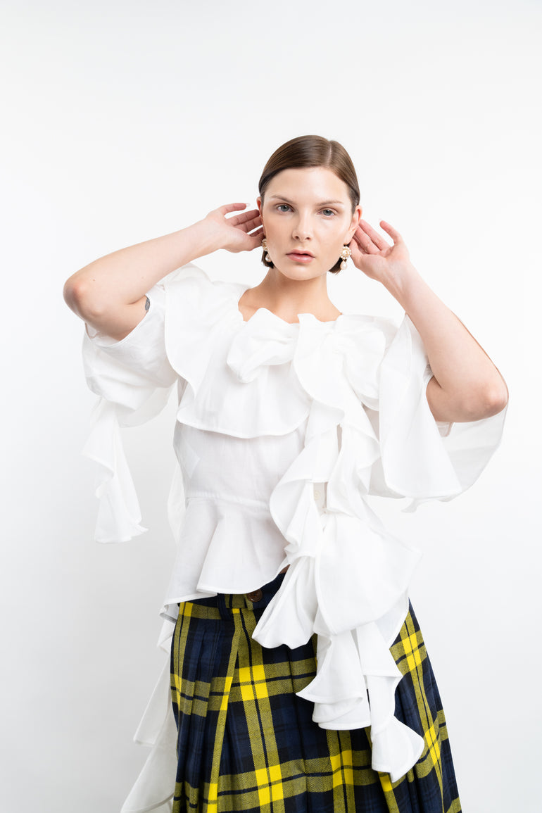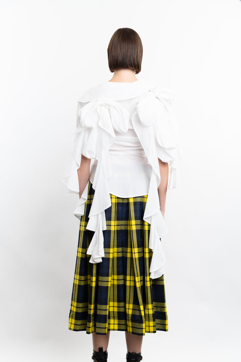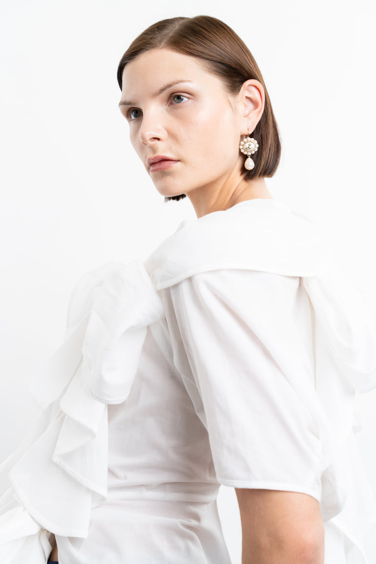 Draped top with asymmetric neckline, oversized bow detail, peplum hem and ruching detailing.