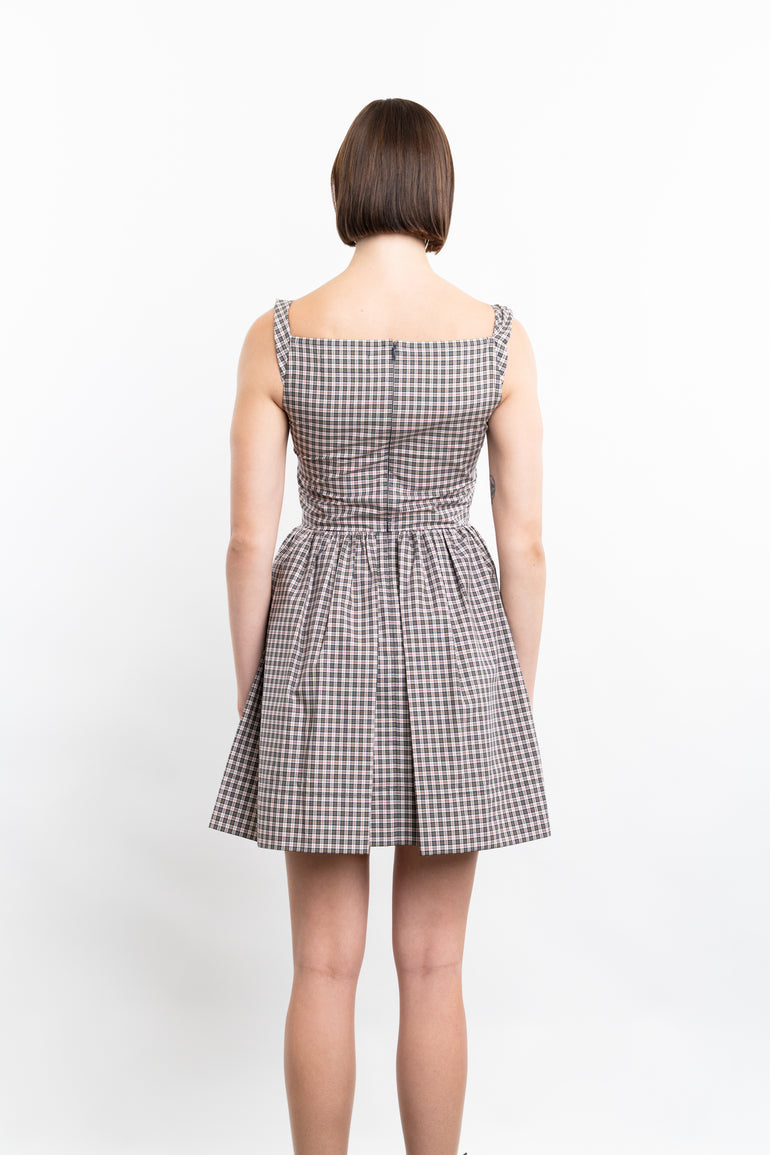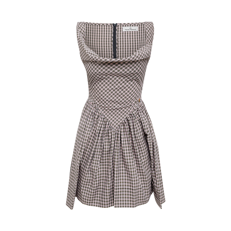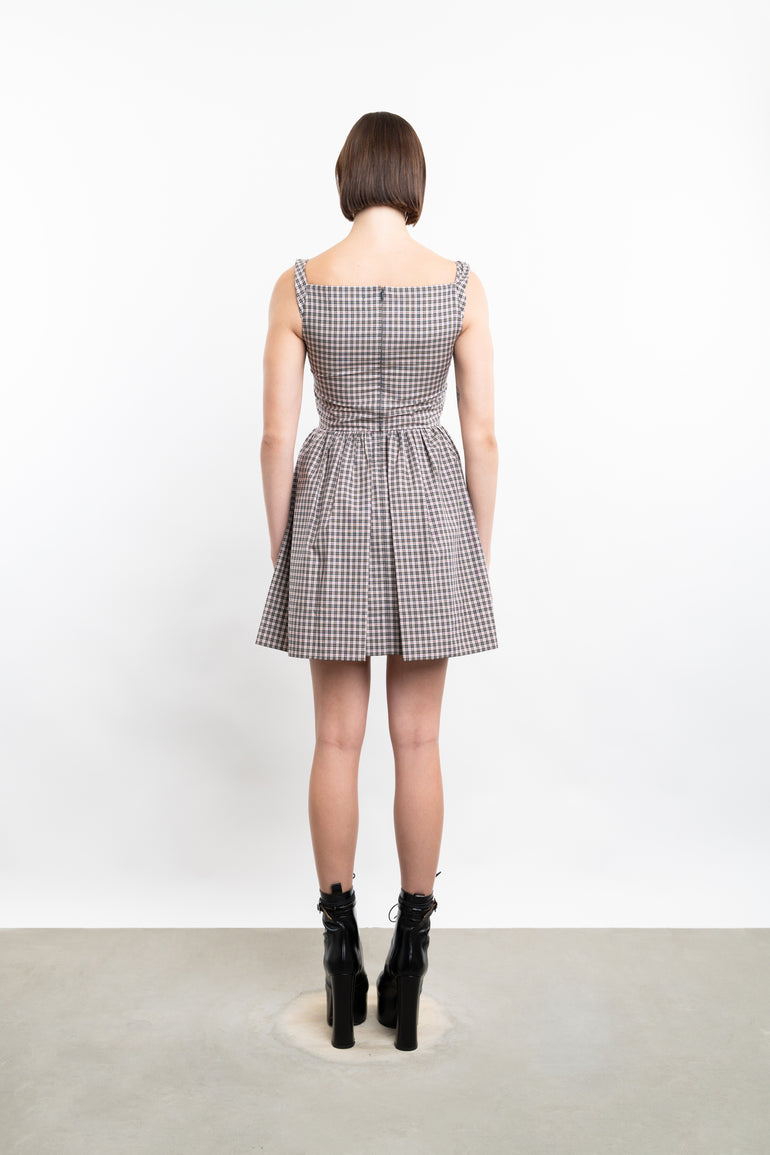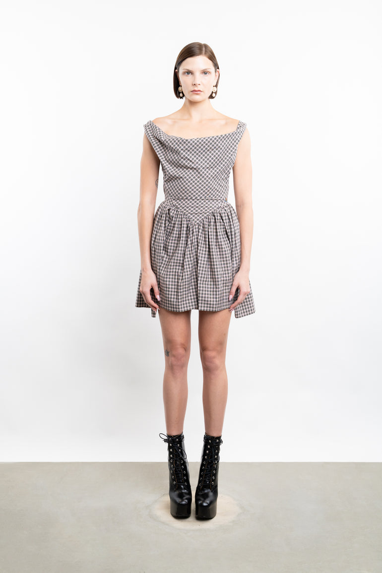 Minidress in corset-inspired silhouette with draped neckline, darting details, pleat detailing and concealed zip fastening.