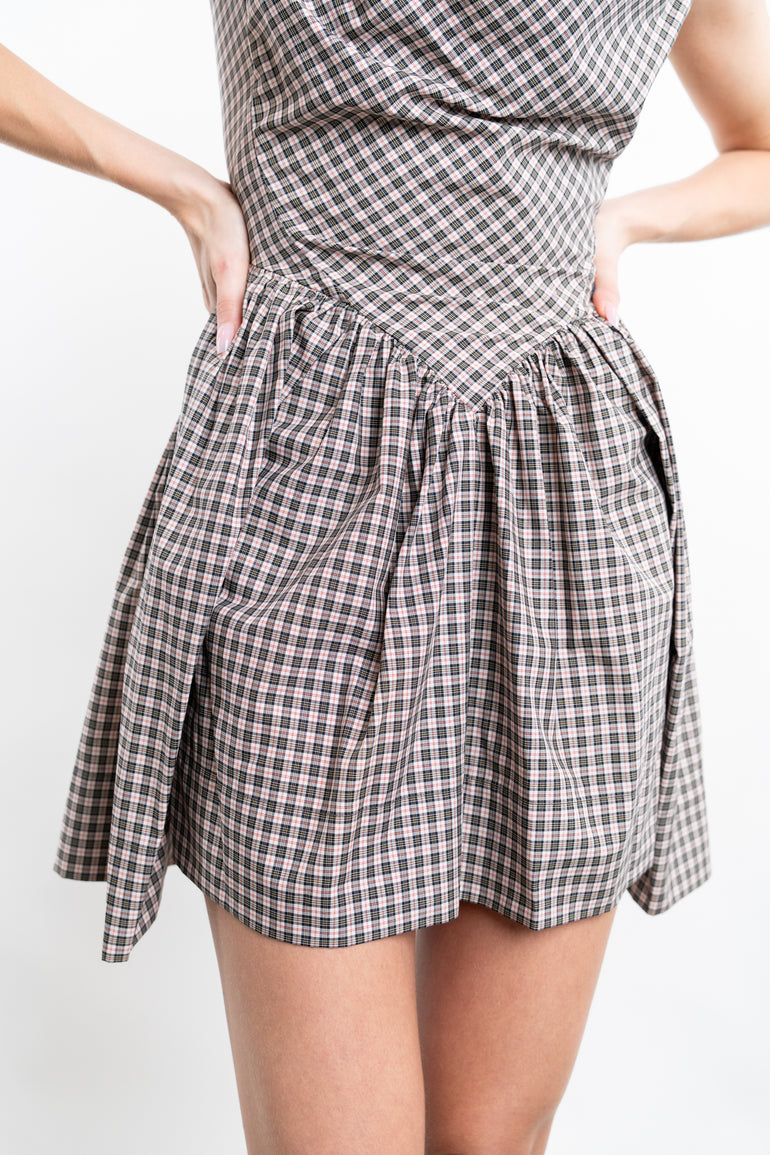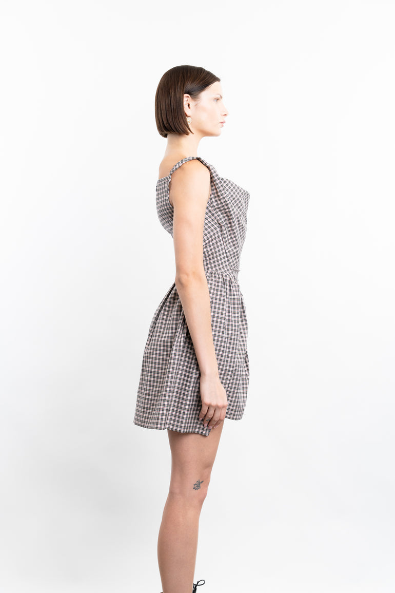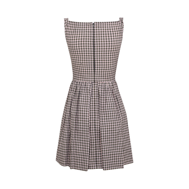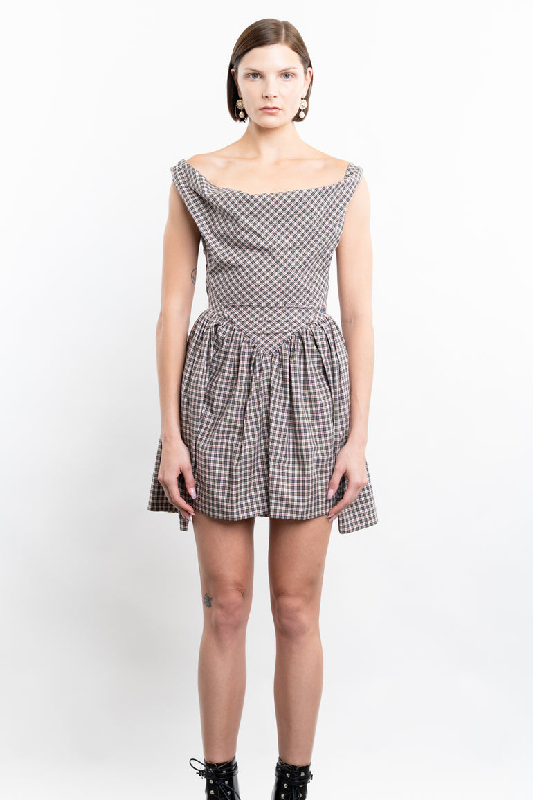 Minidress in corset-inspired silhouette with draped neckline, darting details, pleat detailing and concealed zip fastening.