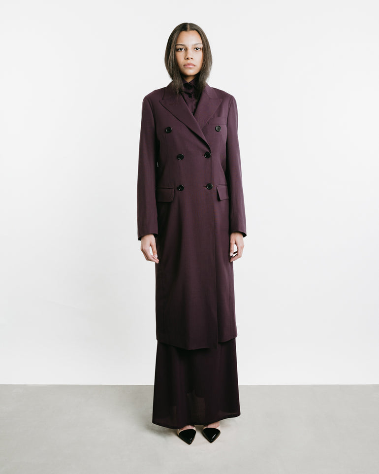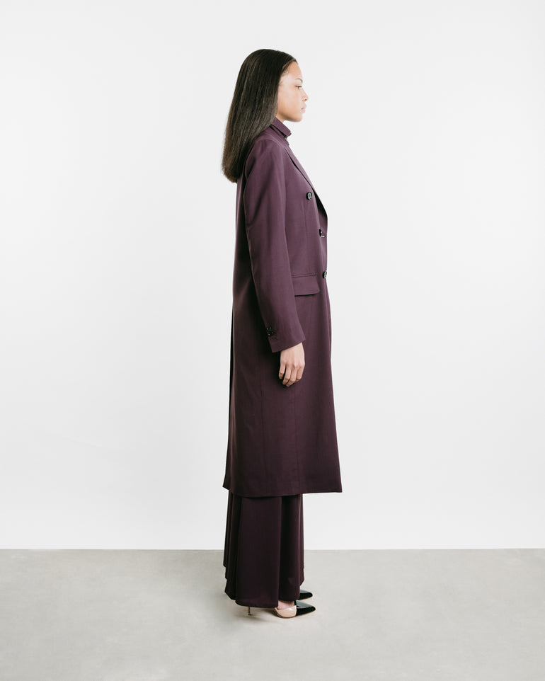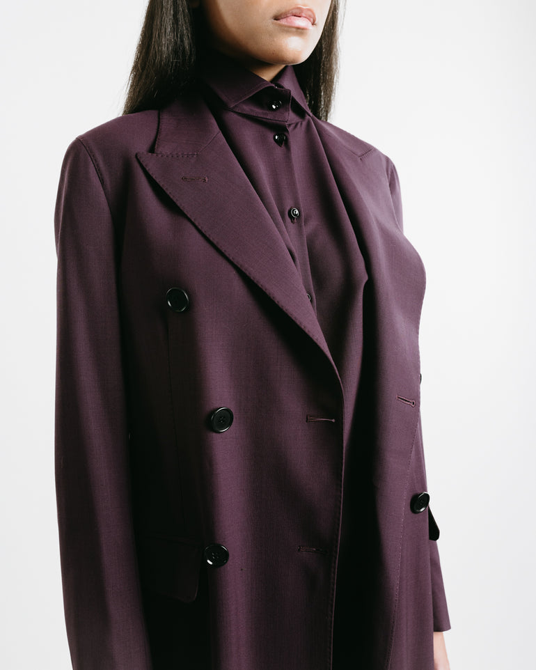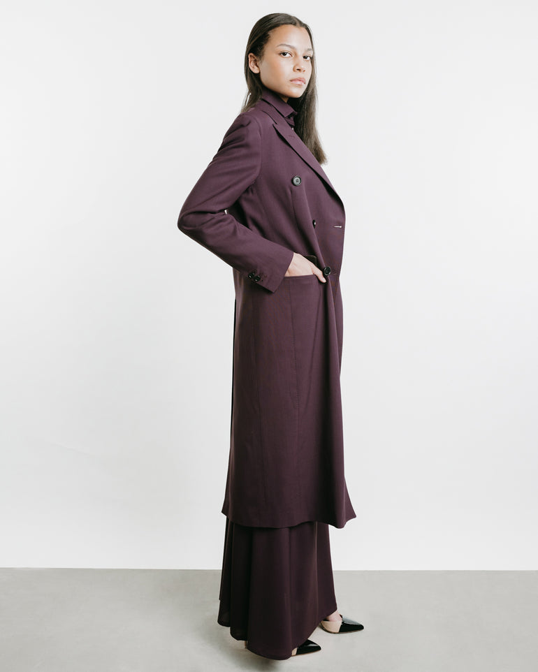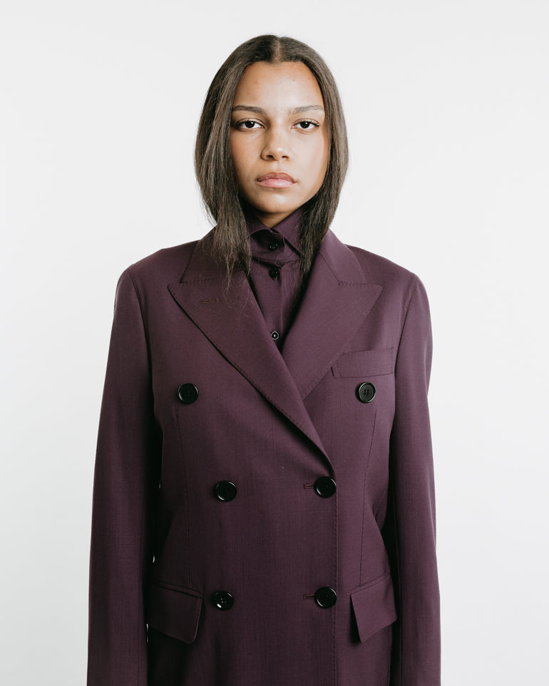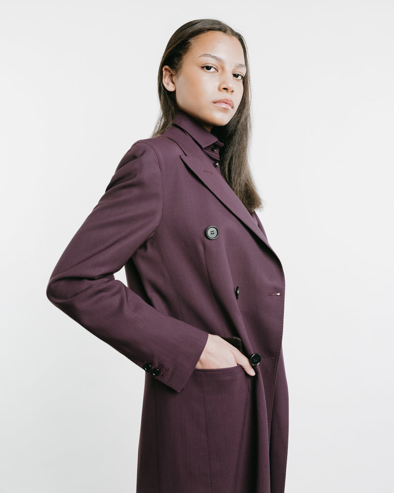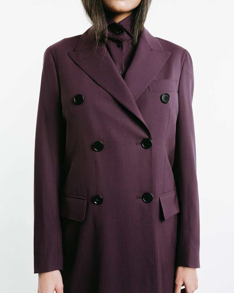 Tailored double-breasted coat with six buttons, peak lapels and flap pockets. Lined.