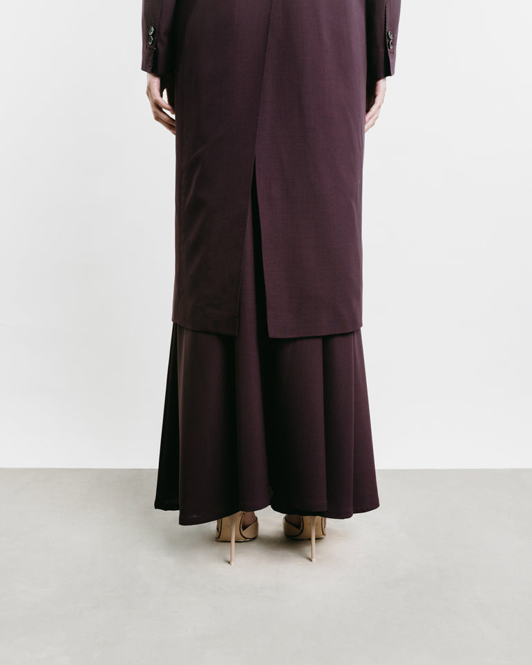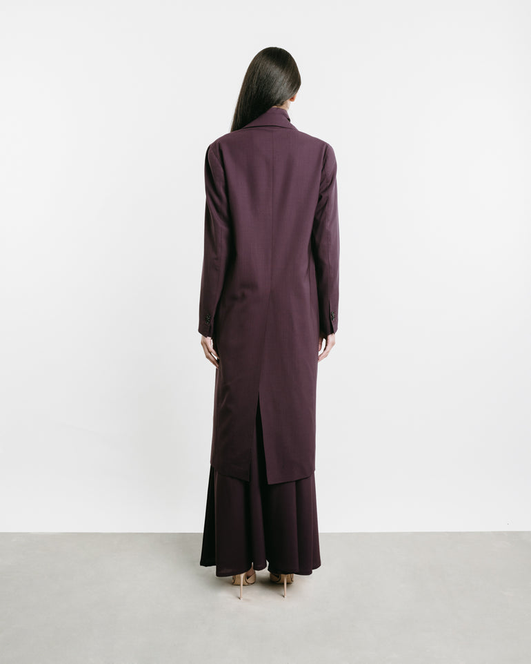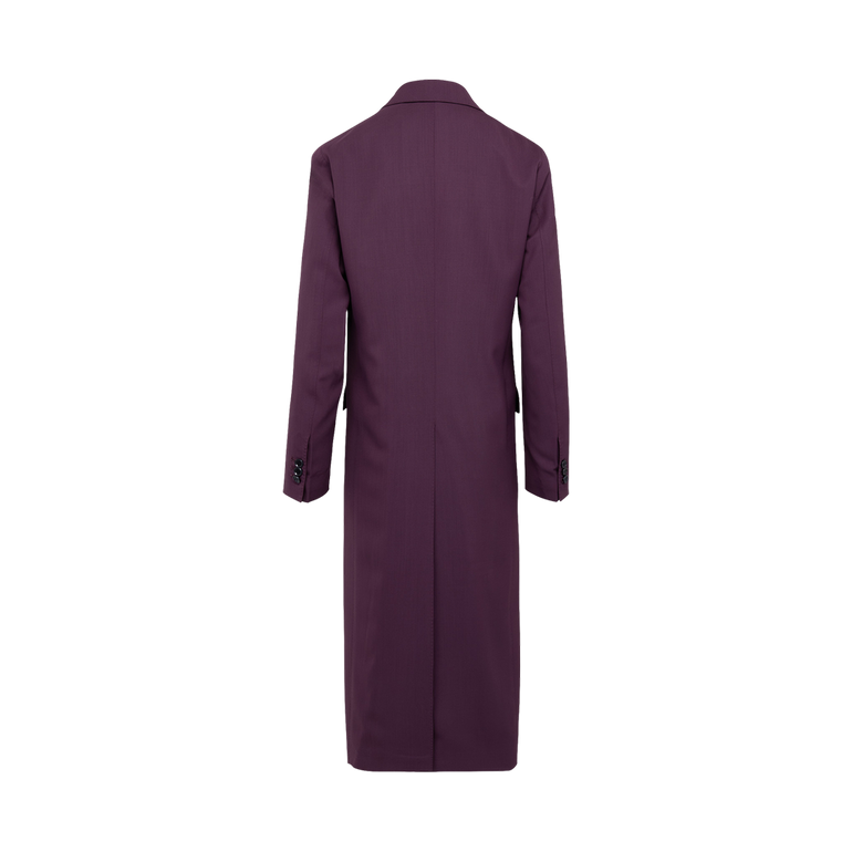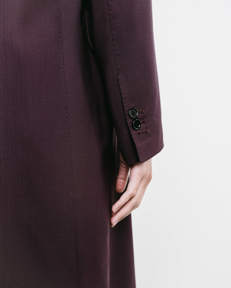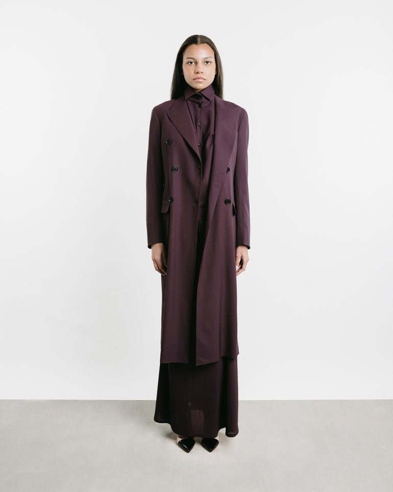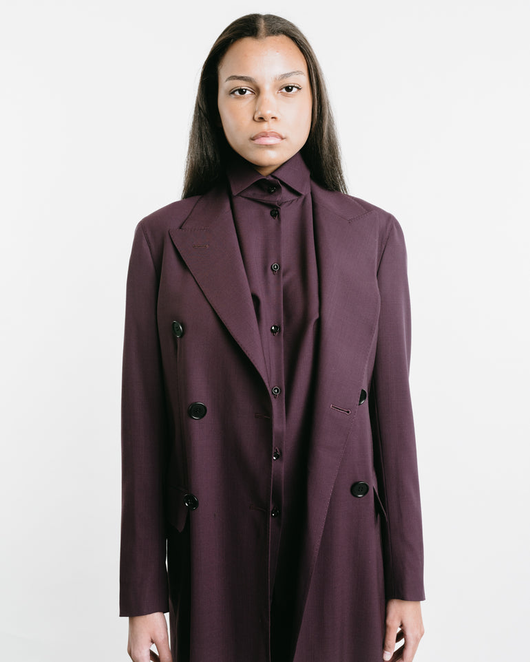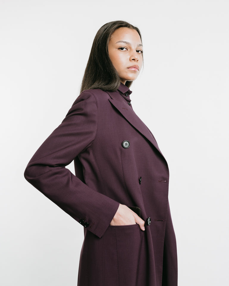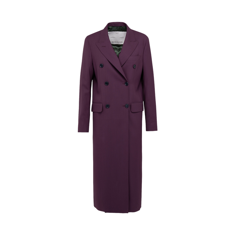 Tailored double-breasted coat with six buttons, peak lapels and flap pockets. Lined.