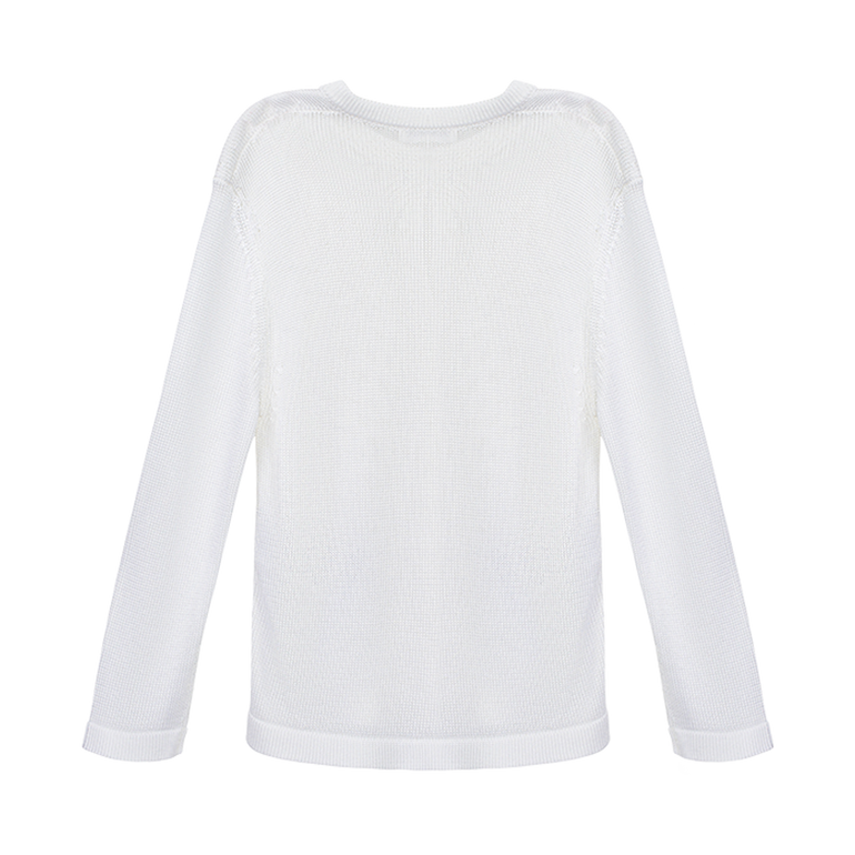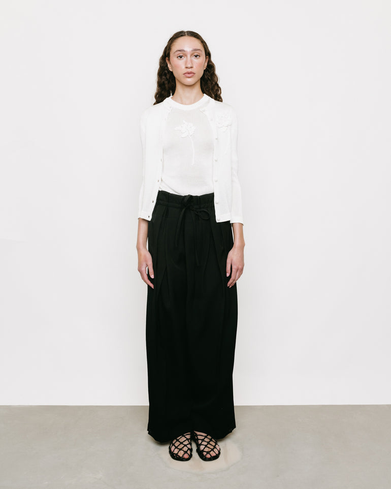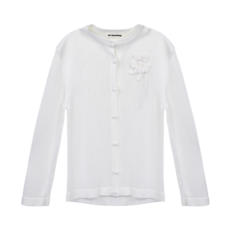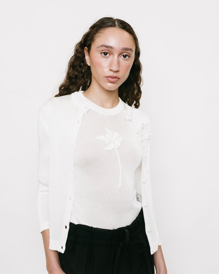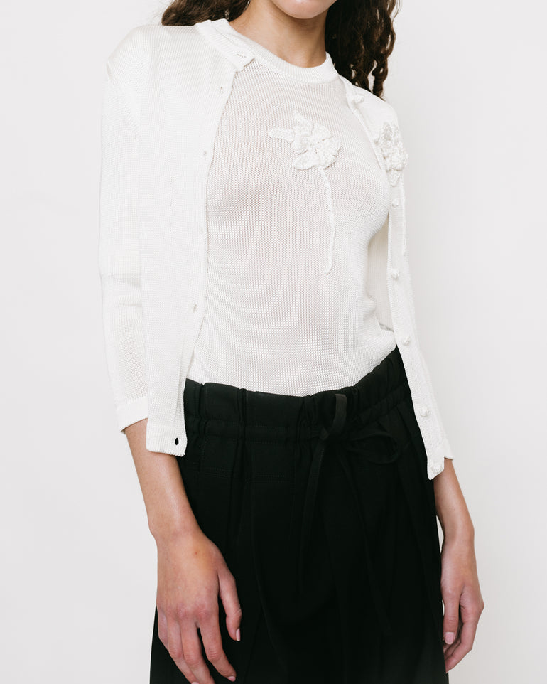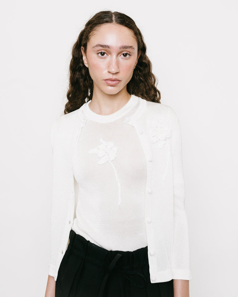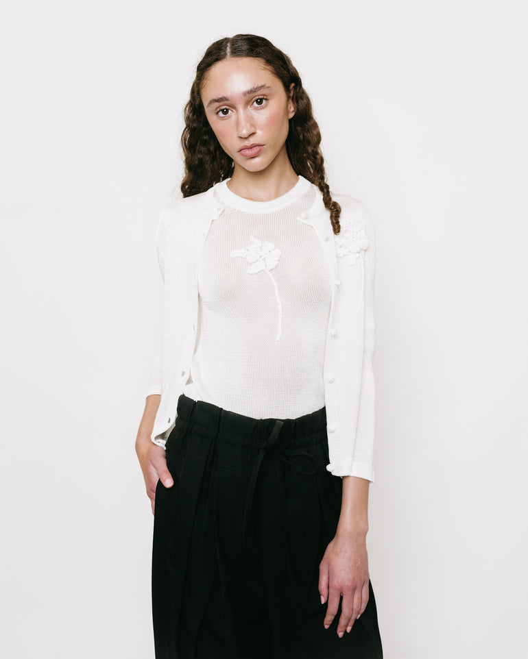 Cardigan with crochet flower on chest, crew neckline, button front and three-quarter sleeves.
