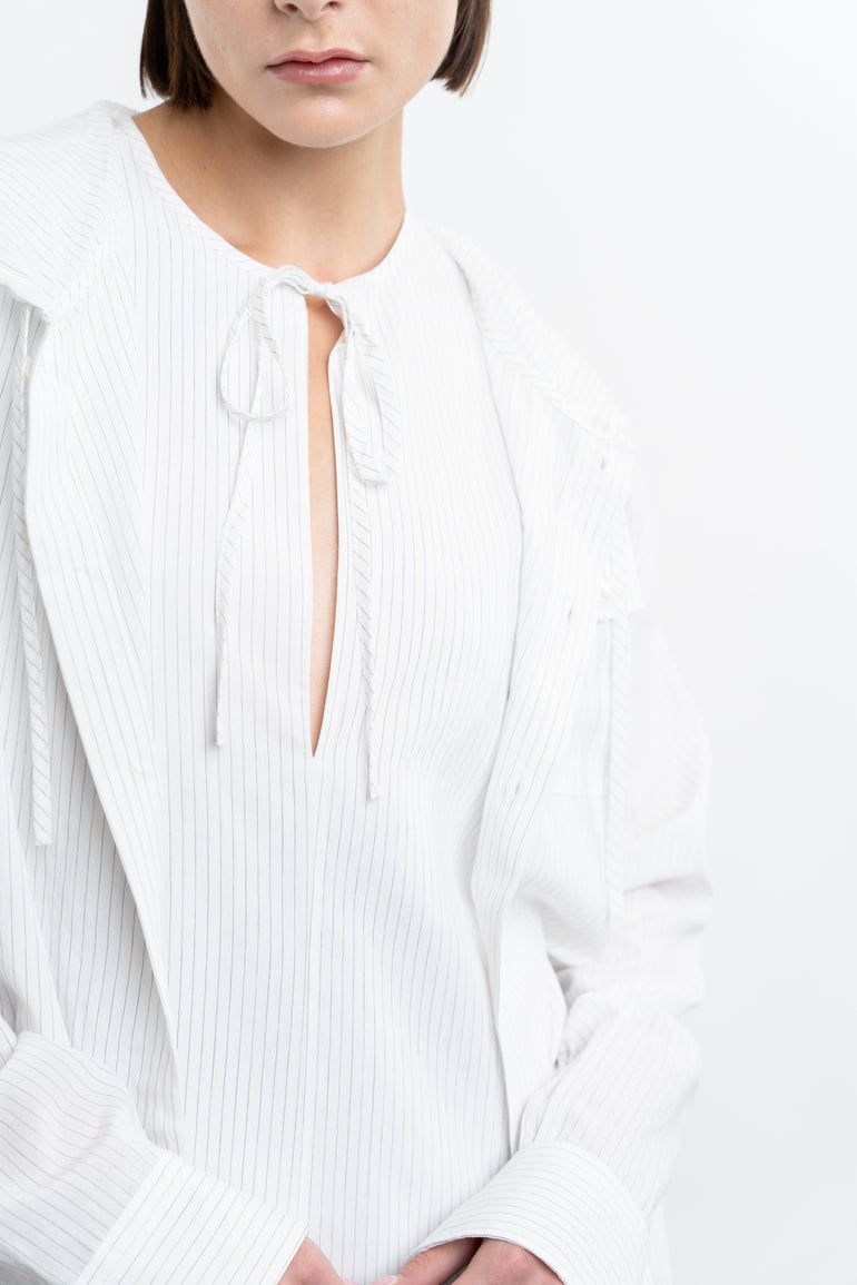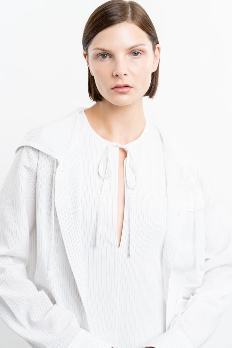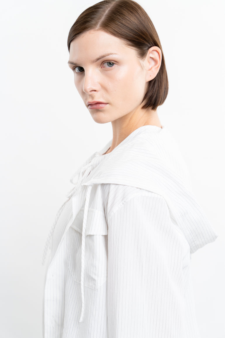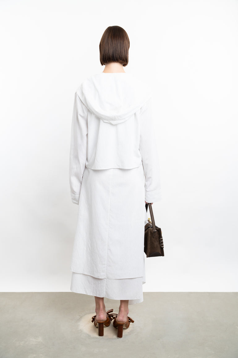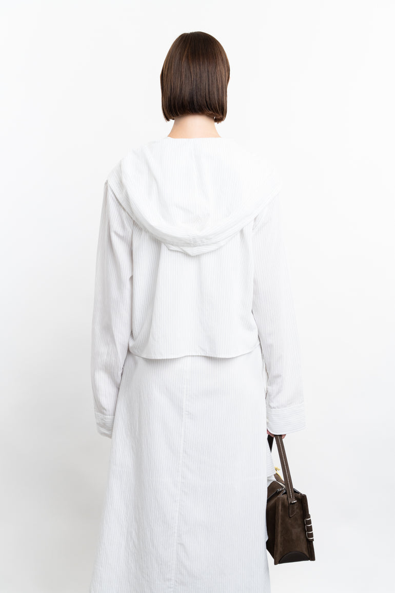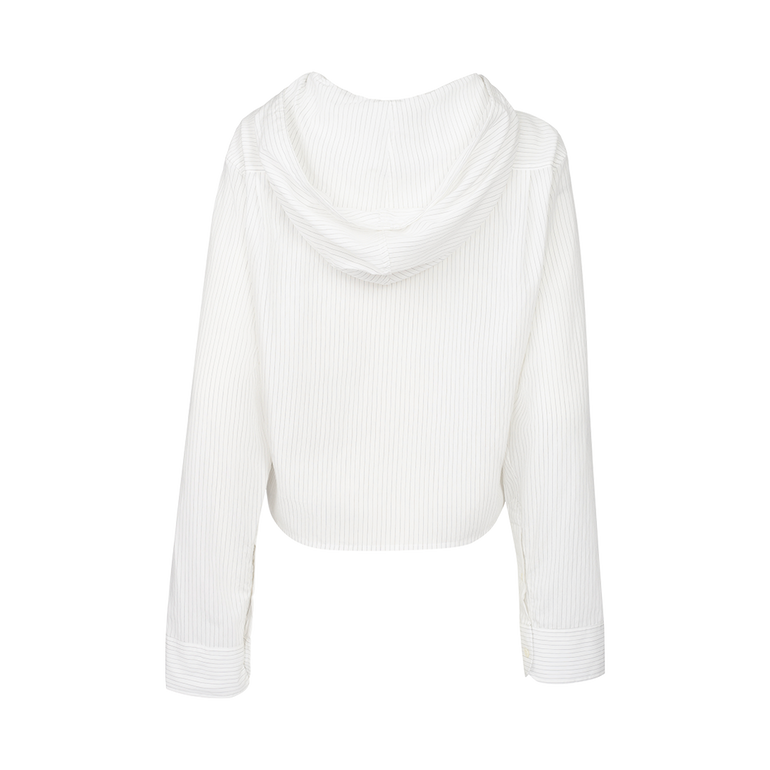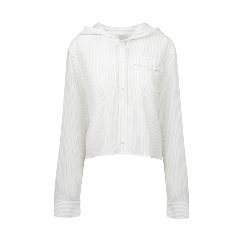 Hooded crop shirt with buttoned chest pocket and long sleeves with buttoned cuffs.