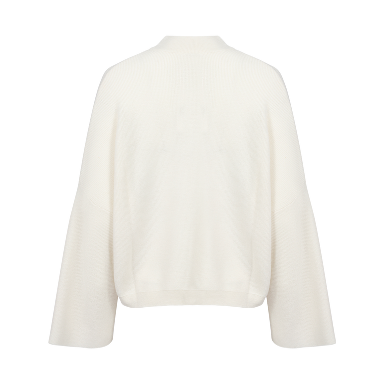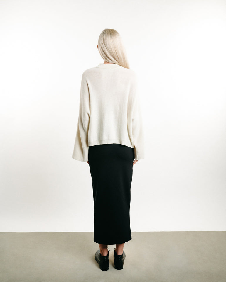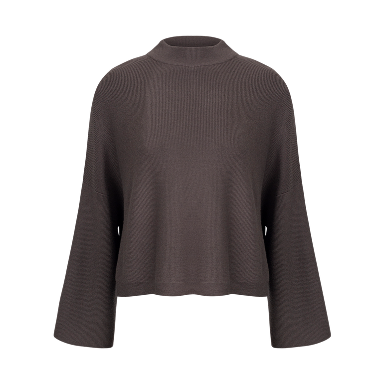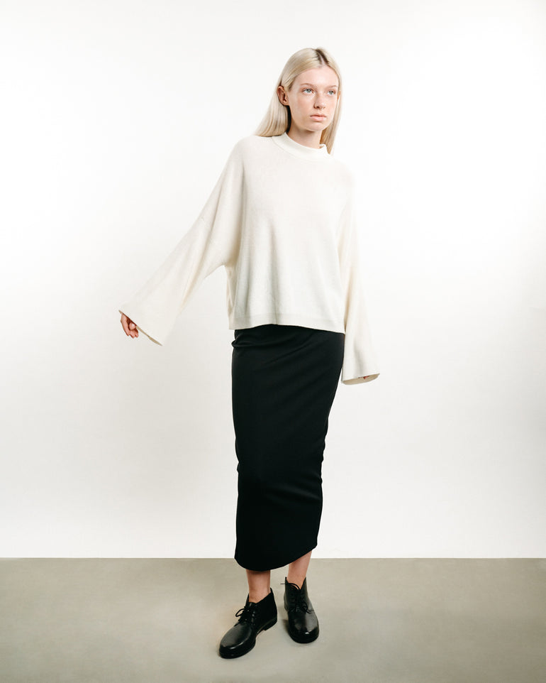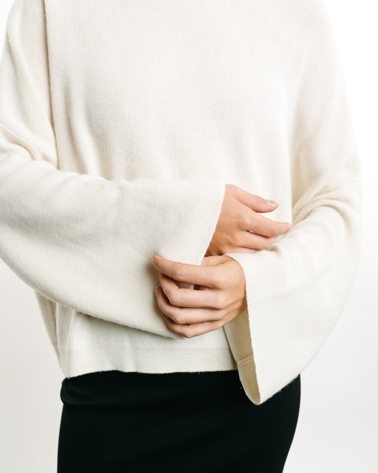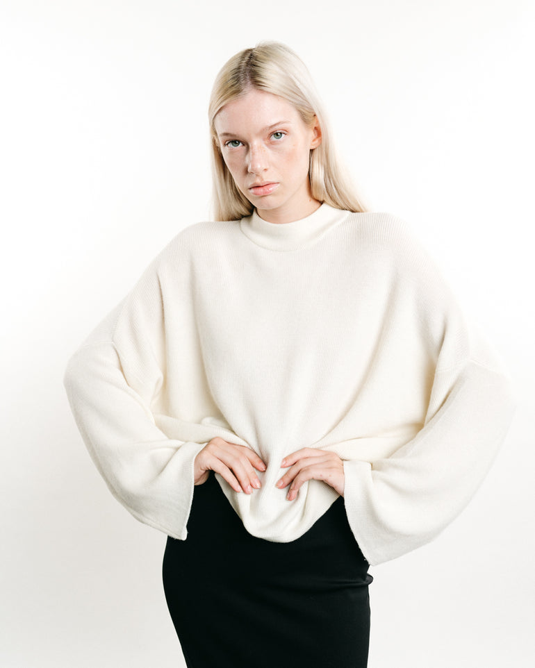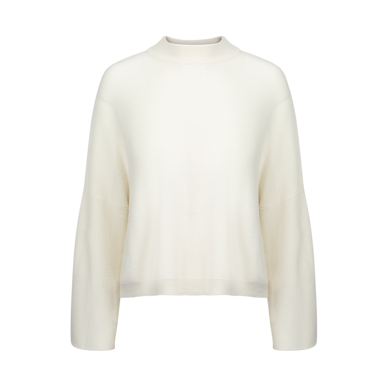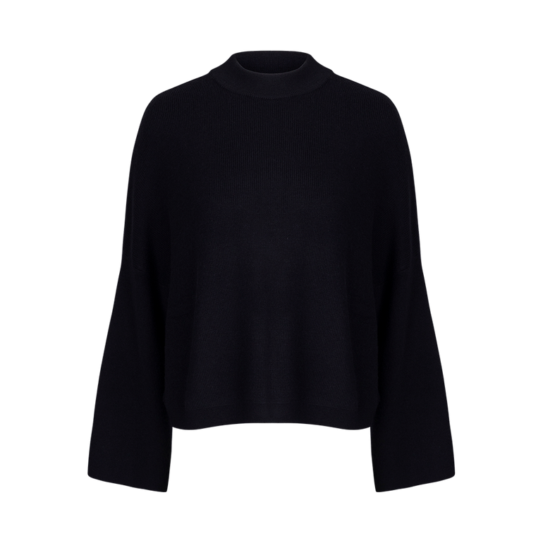 Sweater with round neckline, drop shoulders, wide sleeves and slightly cropped hem.