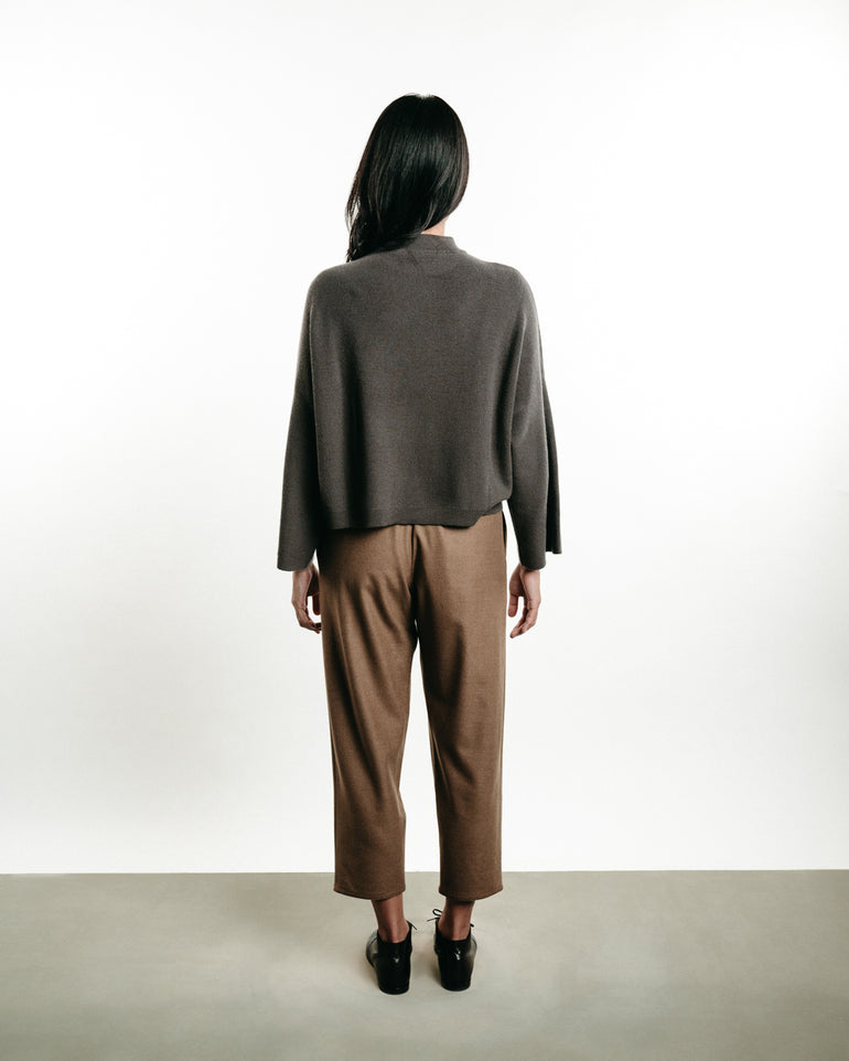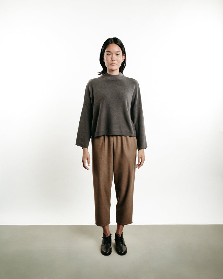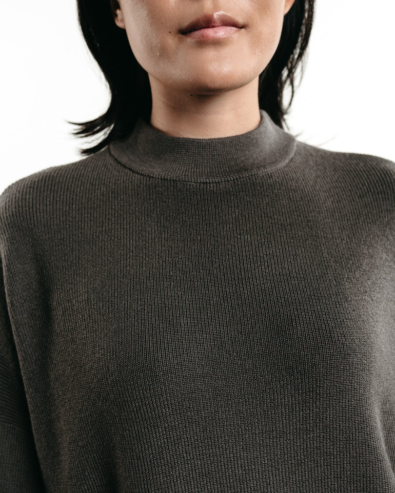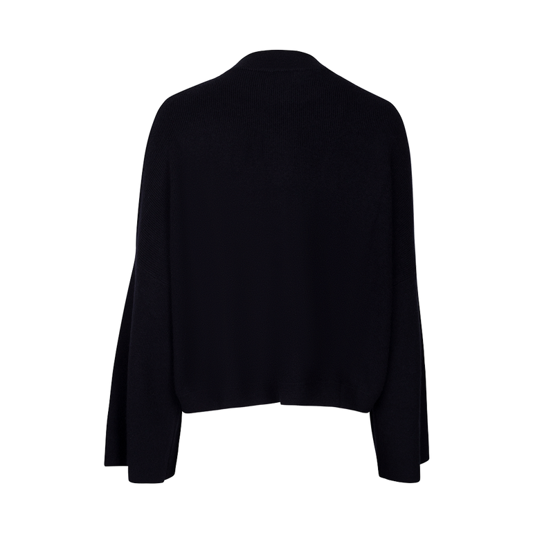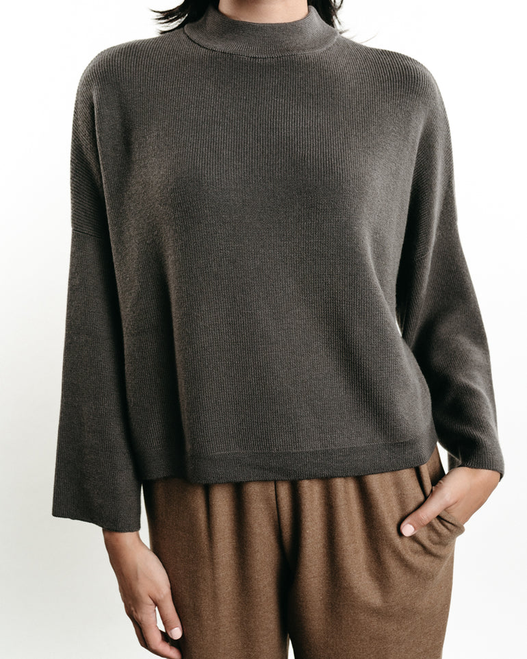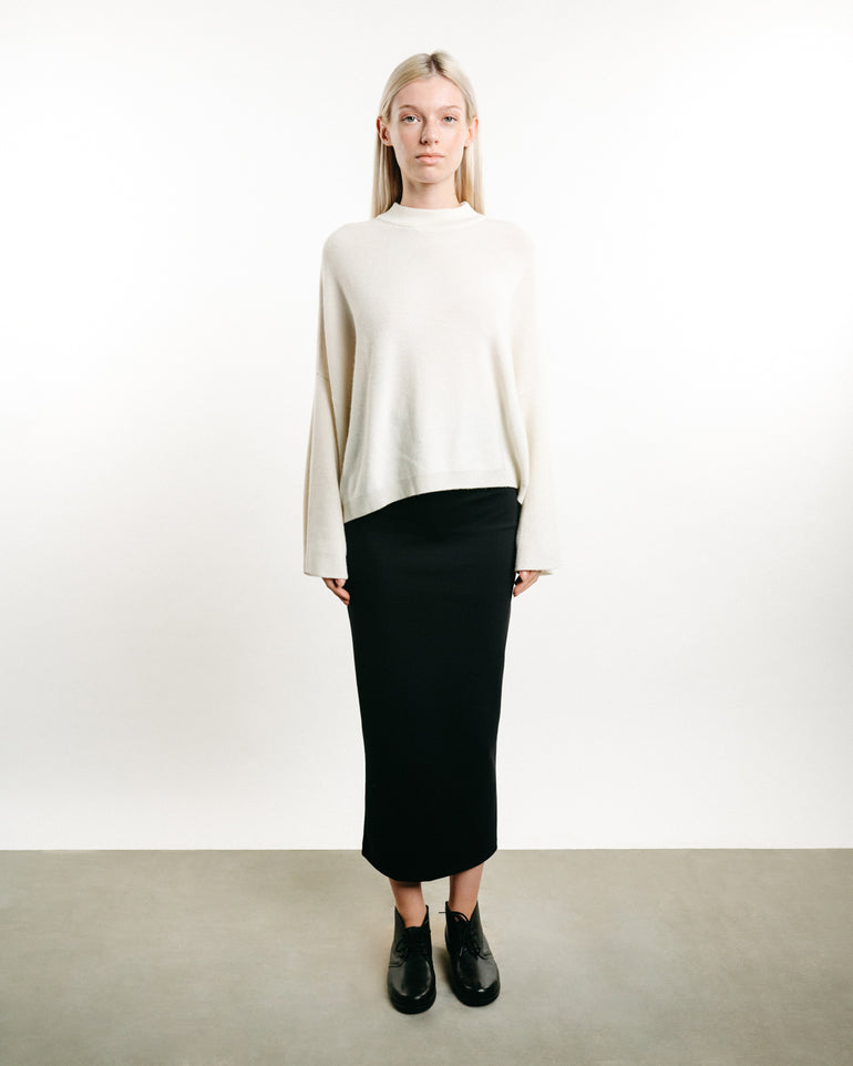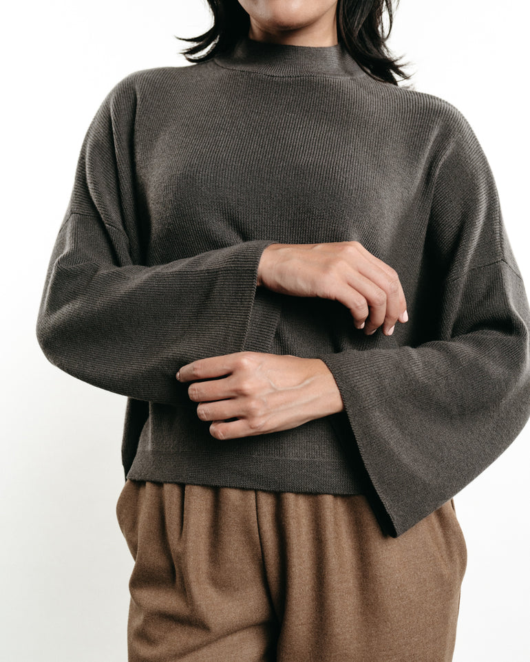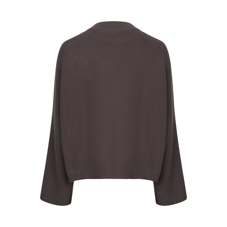 Sweater with round neckline, drop shoulders, wide sleeves and slightly cropped hem.