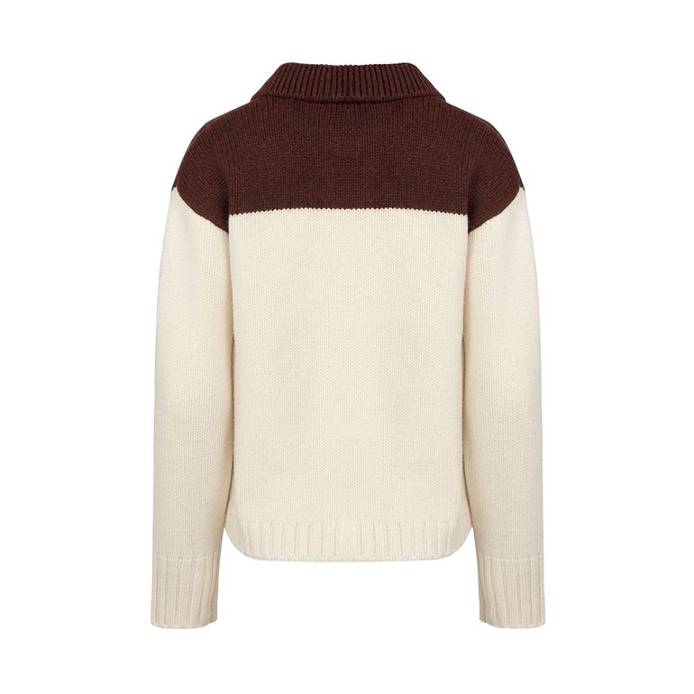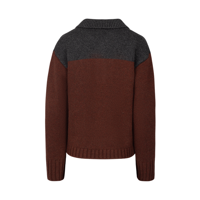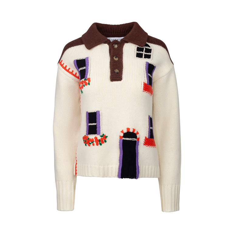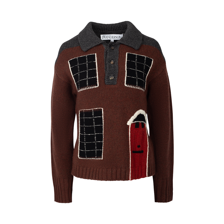 Classic collar, front button placket, drop shoulder and intarsia knit house design.
