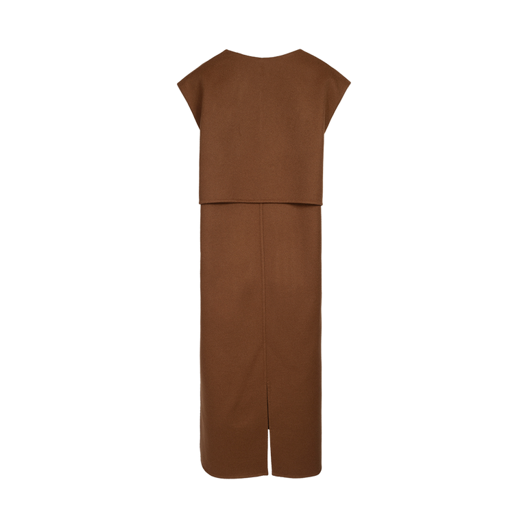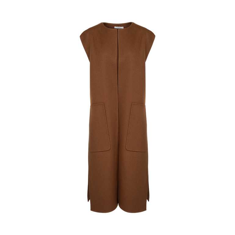Sleeveless vest with round neckline, open front, large patch pockets and high side slits.