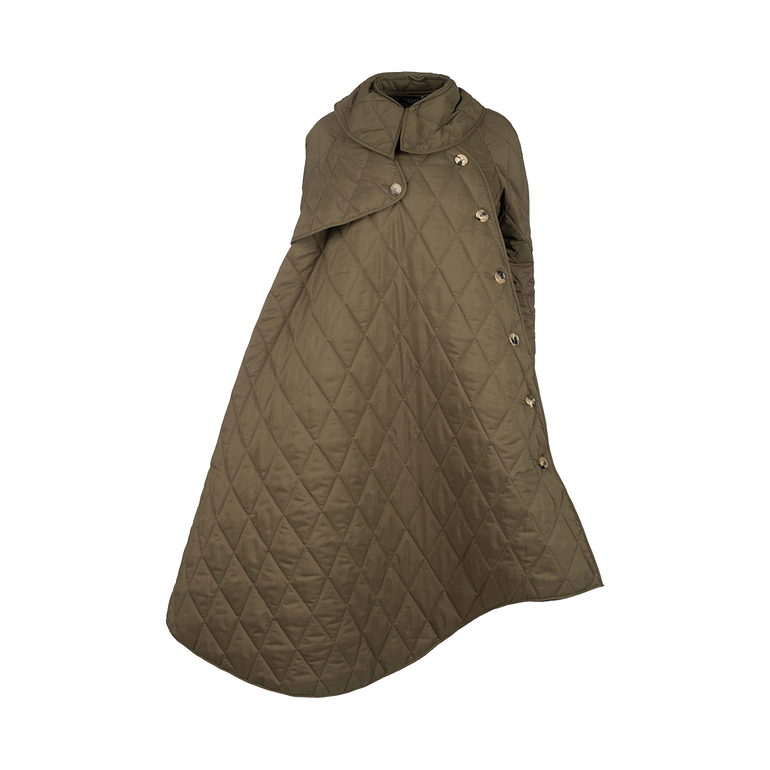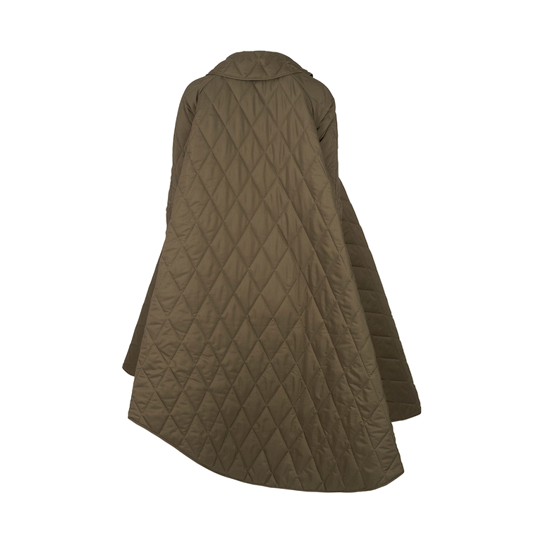 Quilted trench coat with side button closure and asymmetric knee-length hem.