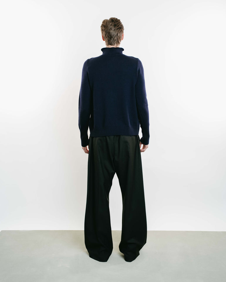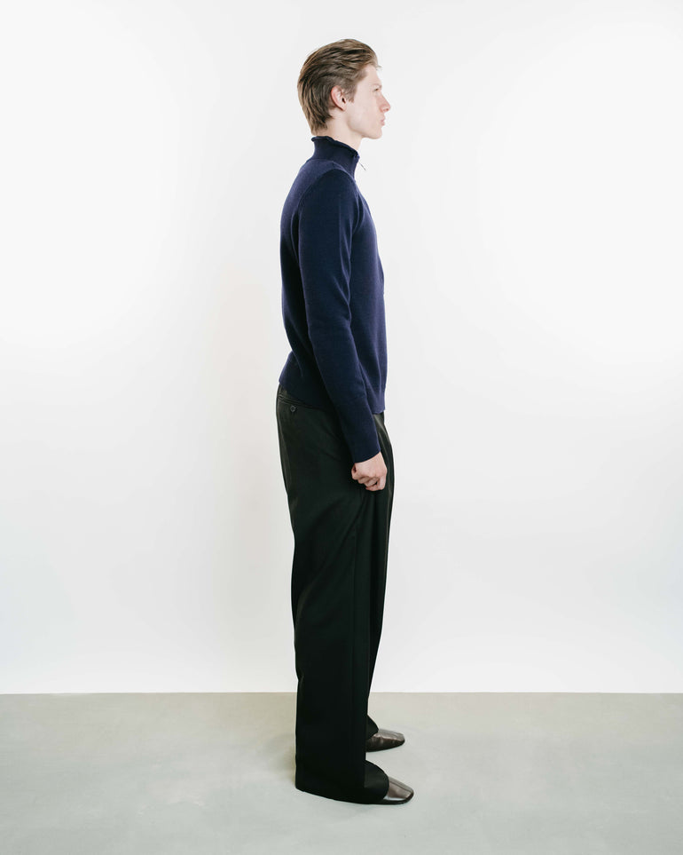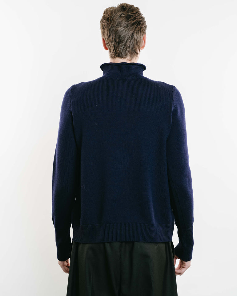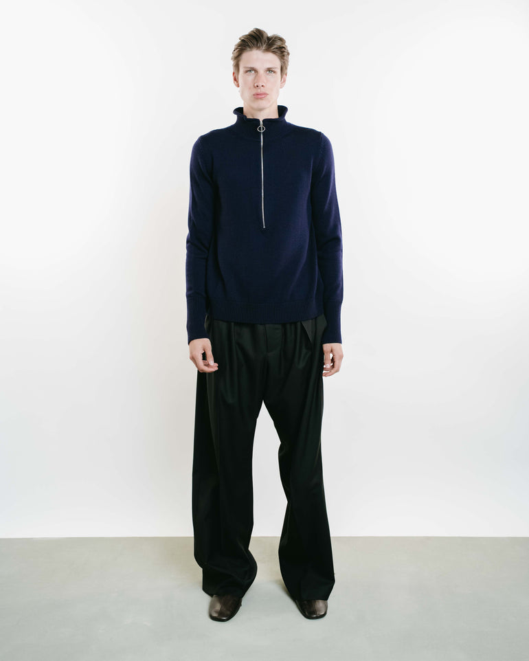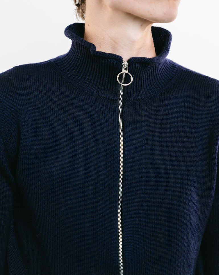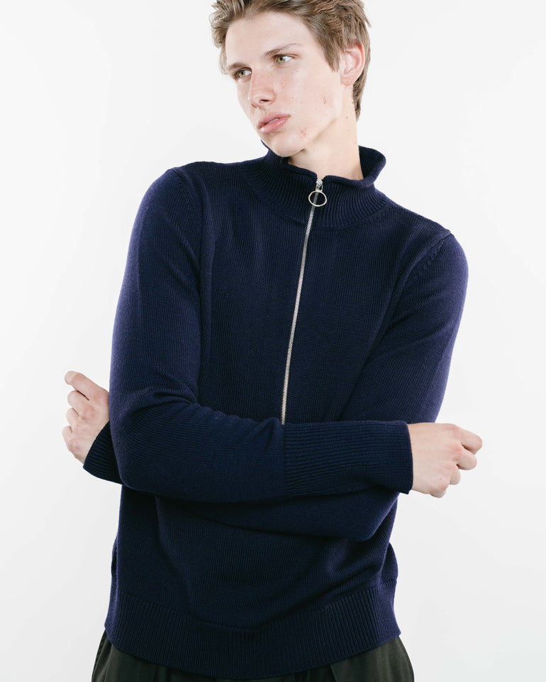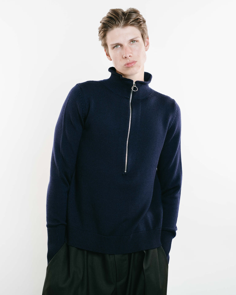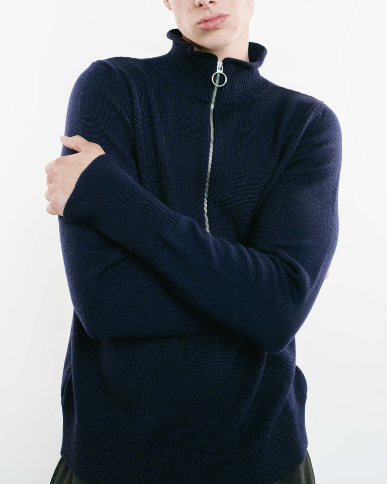 Long sleeve polo with ribbed cuffs and hems and zip closure.