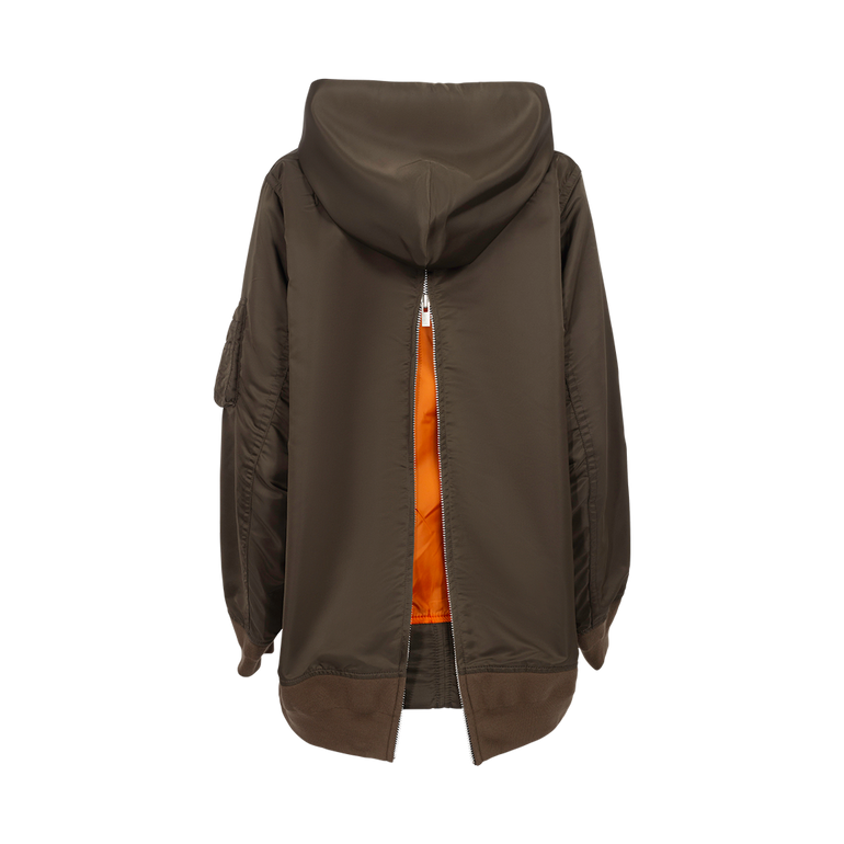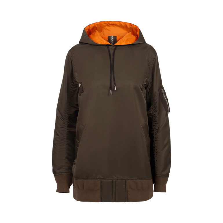Pullover with drawstring hood, front welt pockets, ribbed cuffs and hem and back zip closure.