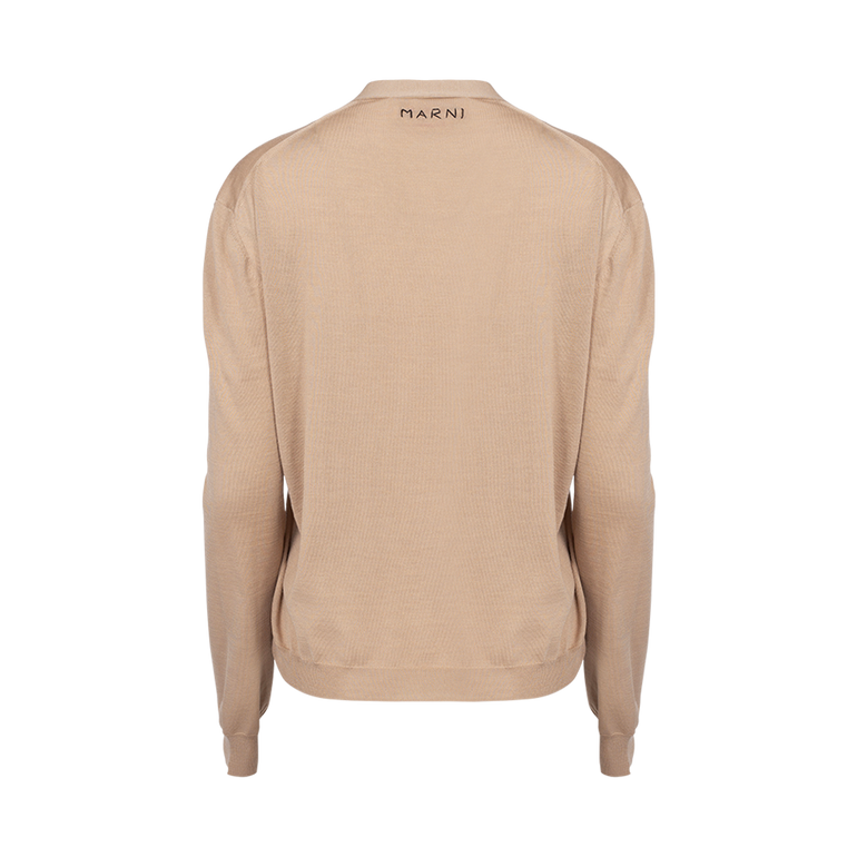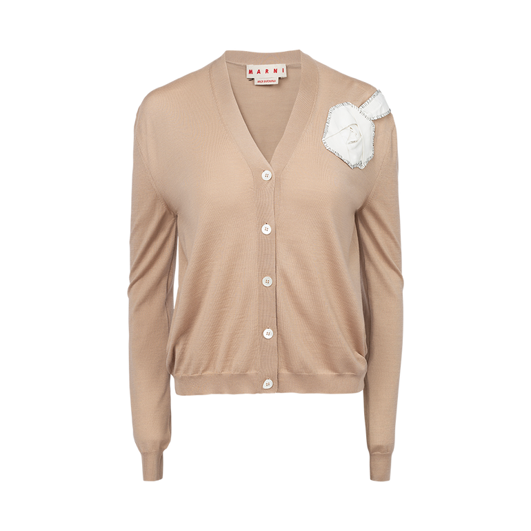 Long-sleeved cardigan with V-neckline, front-button closure and floral appliqué detail.