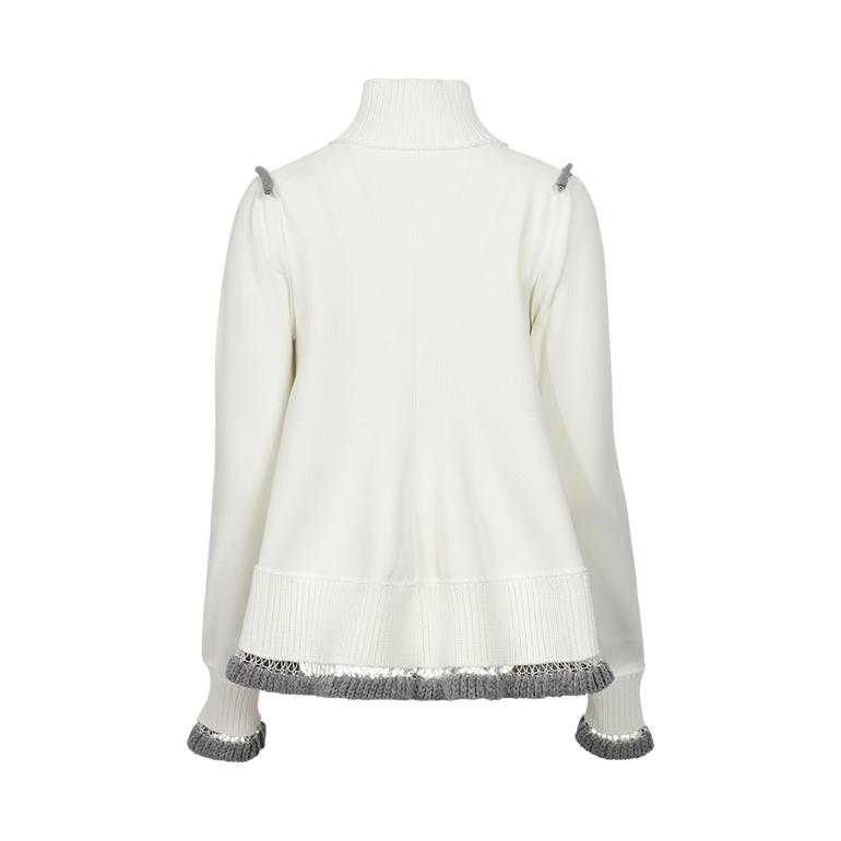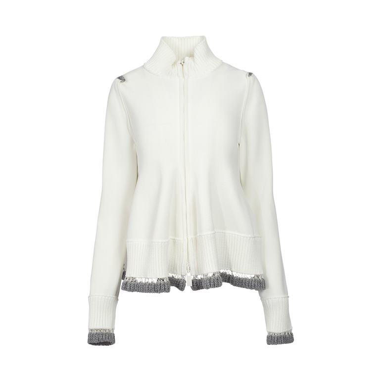 Cardigan with high neckline, front zip and contrast ruffled hem.