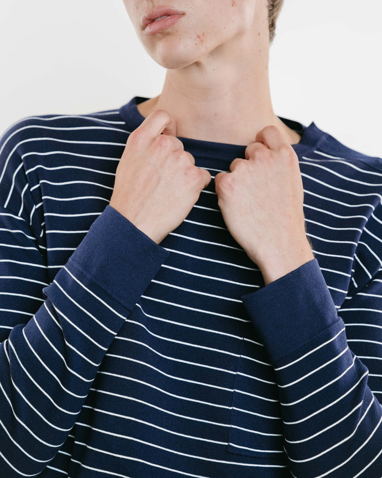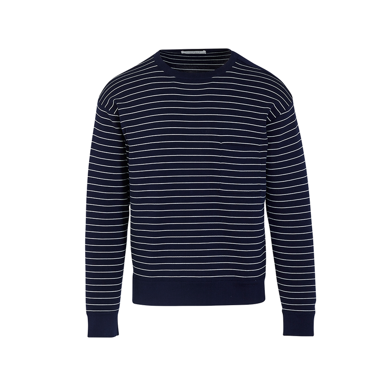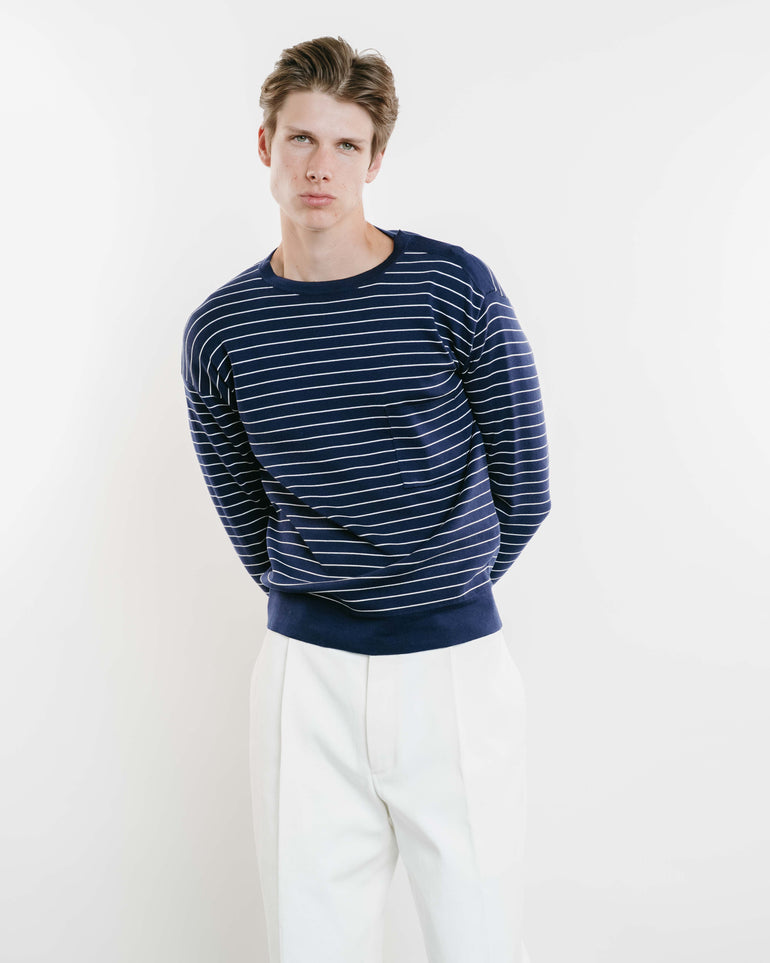 Striped sweater with round neckline, front patch pocket and long sleeves.