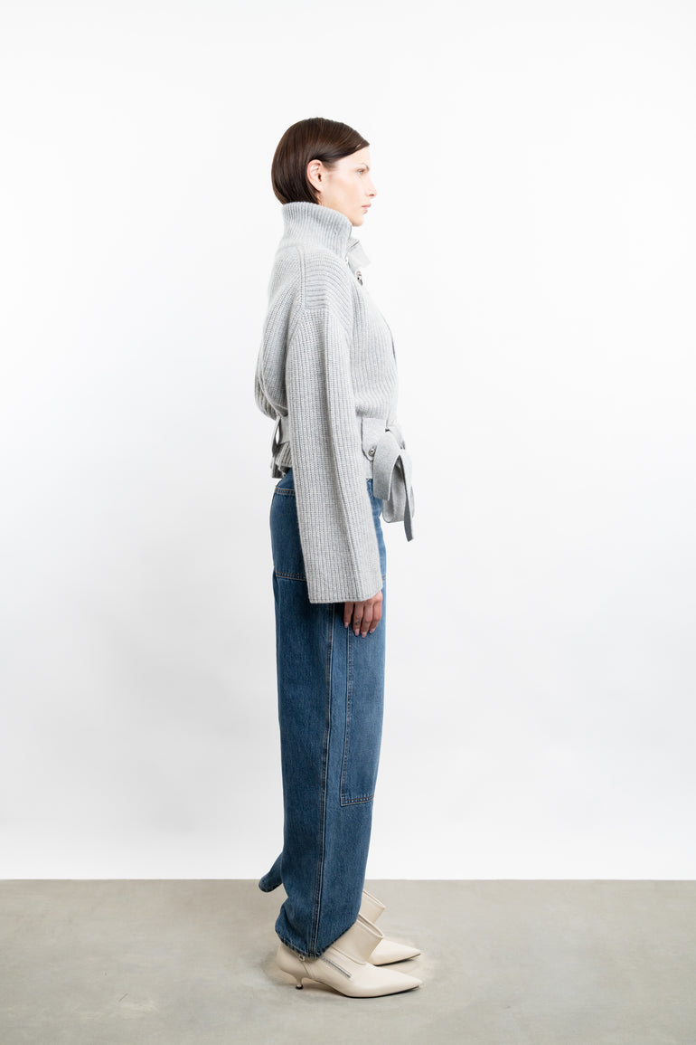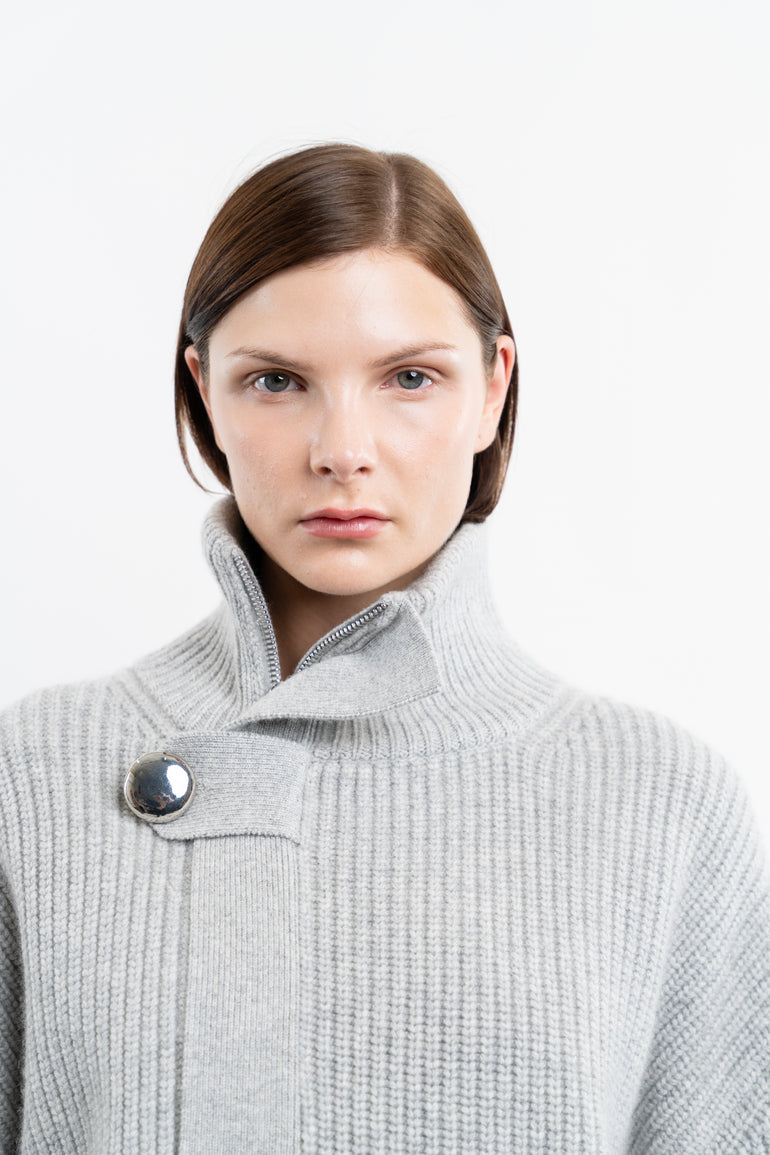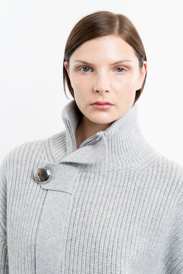 Cardigan with stand collar, asymmetric zip closure and button storm placket.