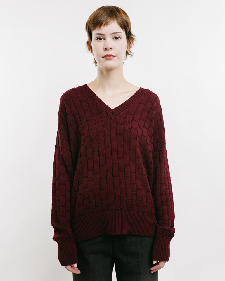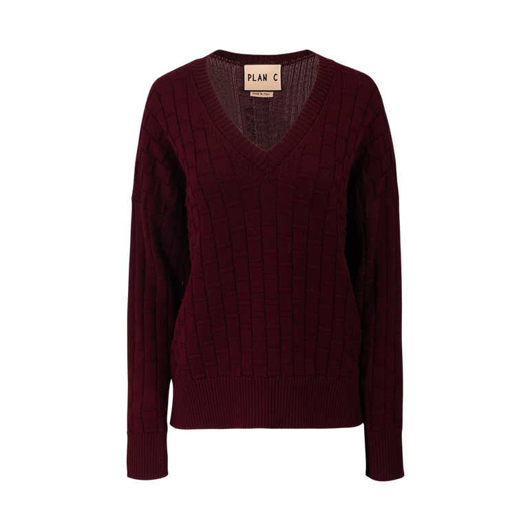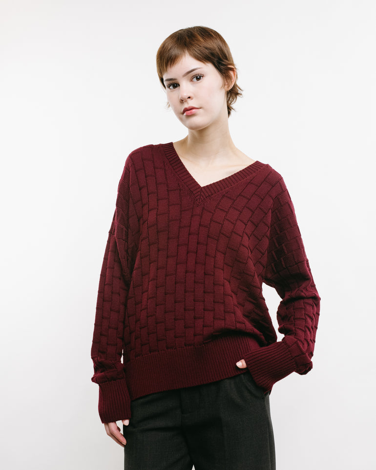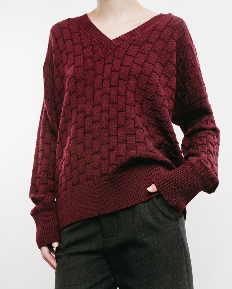 V-neck knit with checked three-dimensional pattern, ribbed neck, cuff and hems.