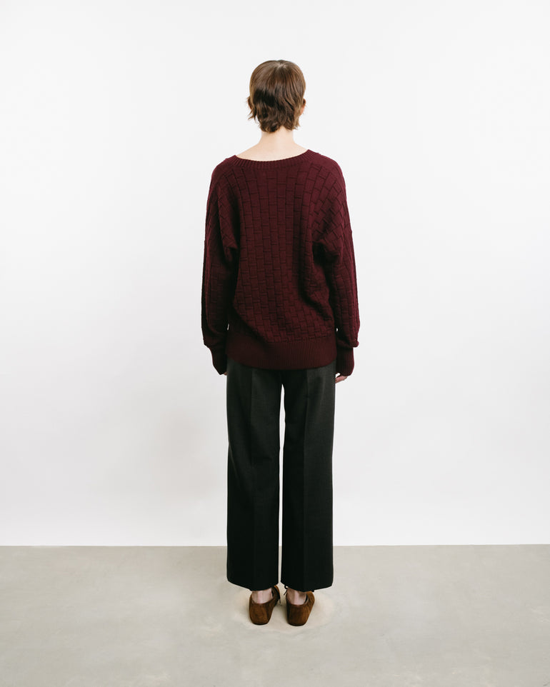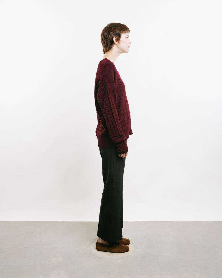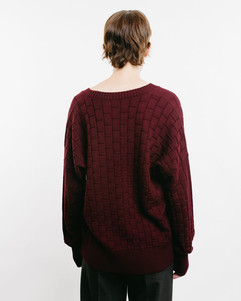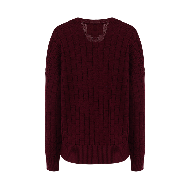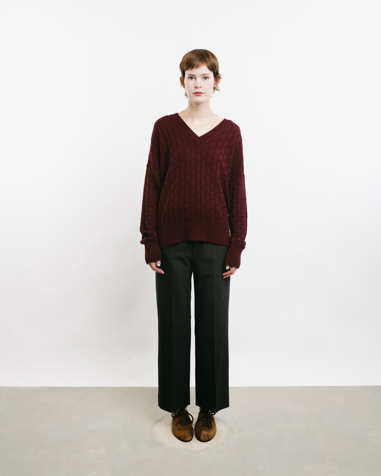 V-neck knit with checked three-dimensional pattern, ribbed neck, cuff and hems.