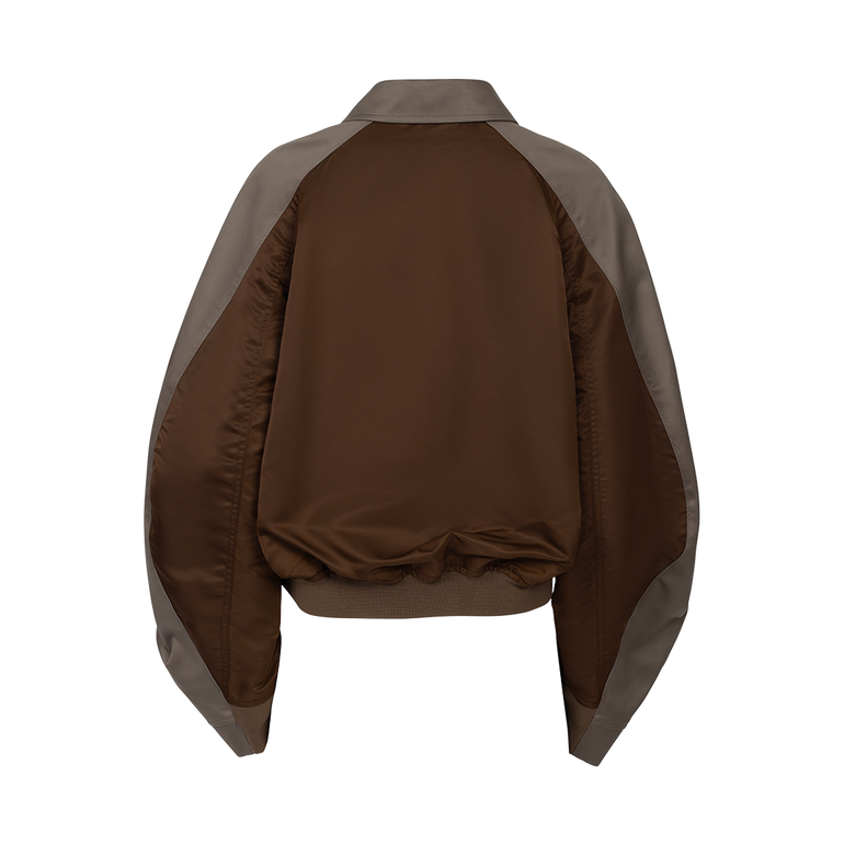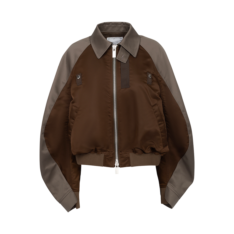Bomber jacket with two-way front zip, point collar, front welt pockets, sleeve zip pocket and ribbed hem.