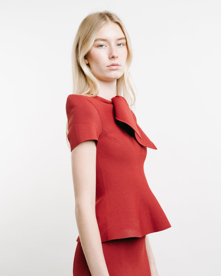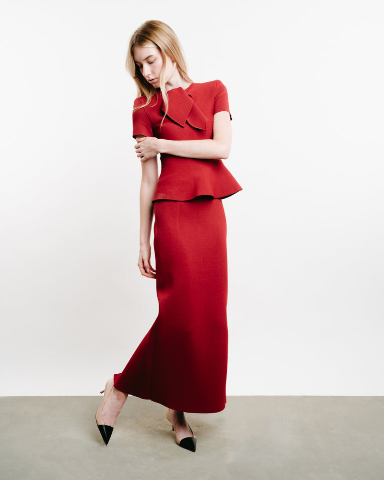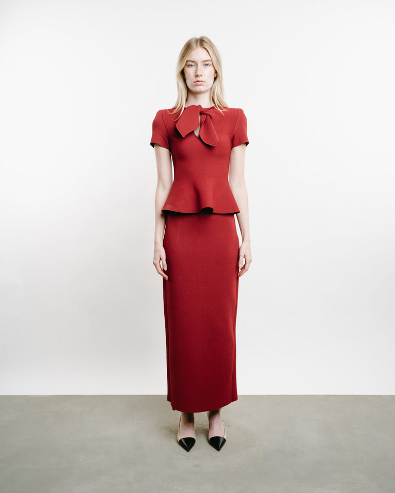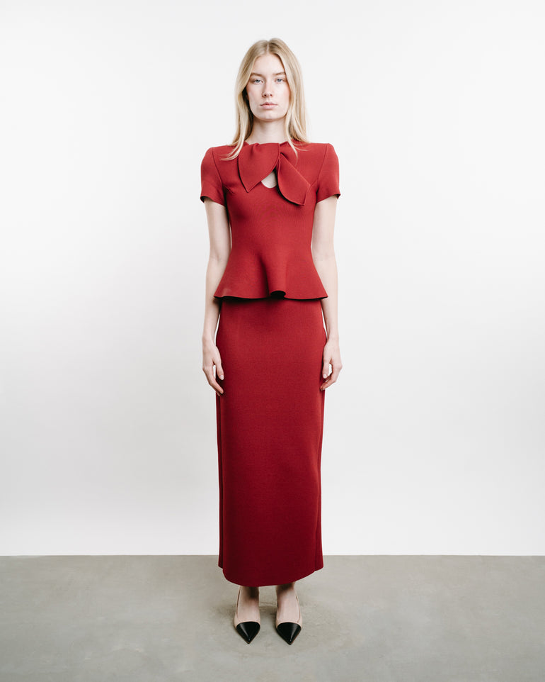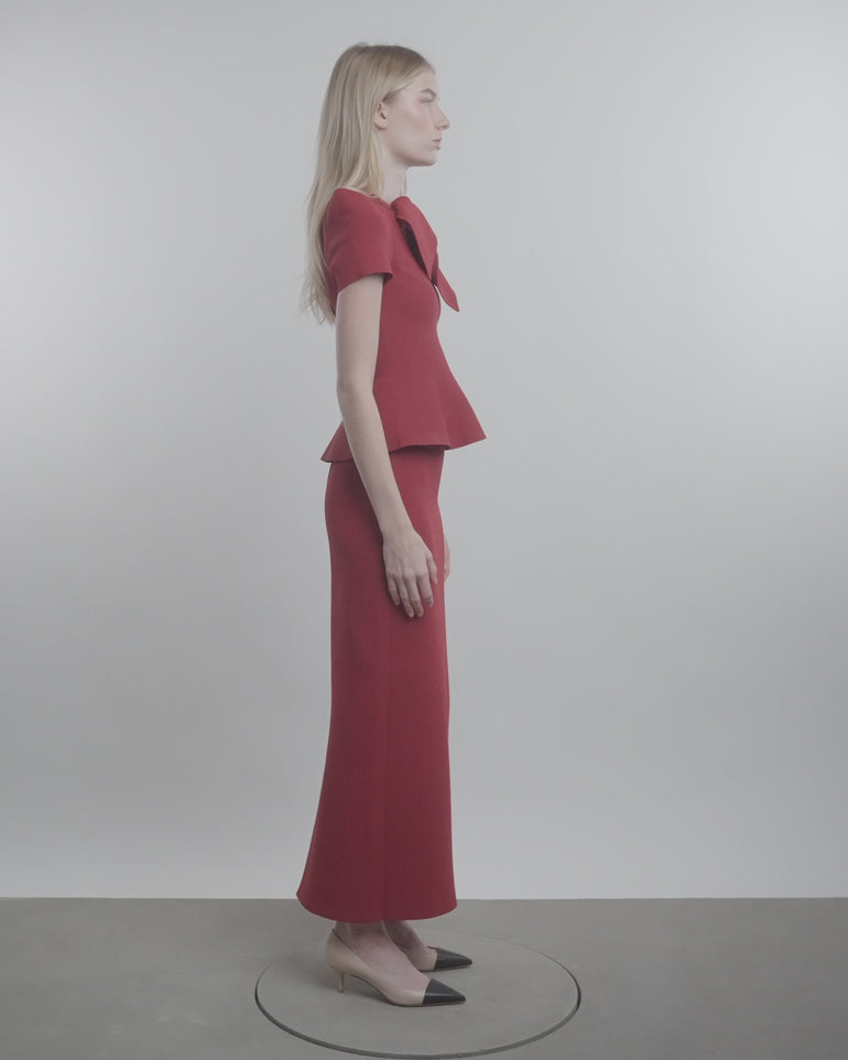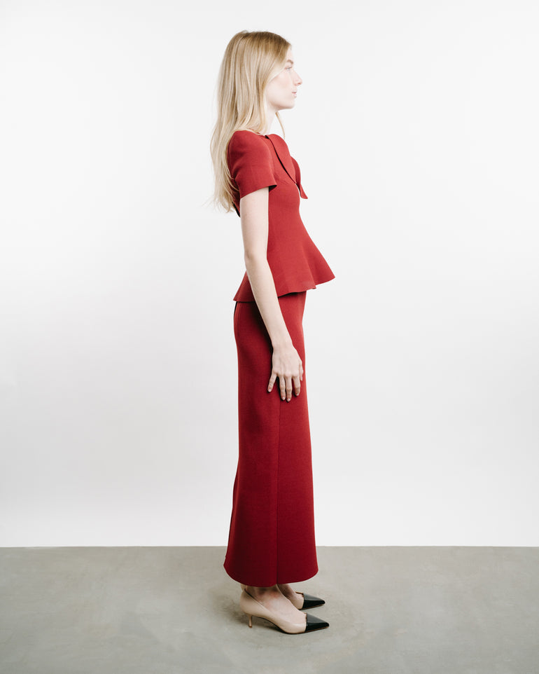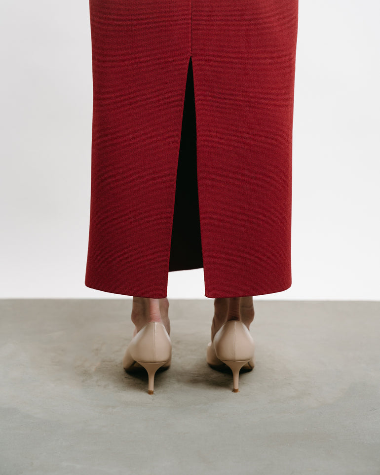 Pencil skirt with high rise, below-knee length, back zip and back split.