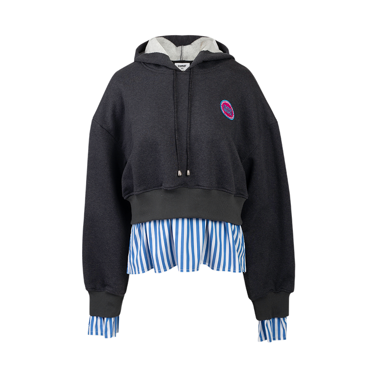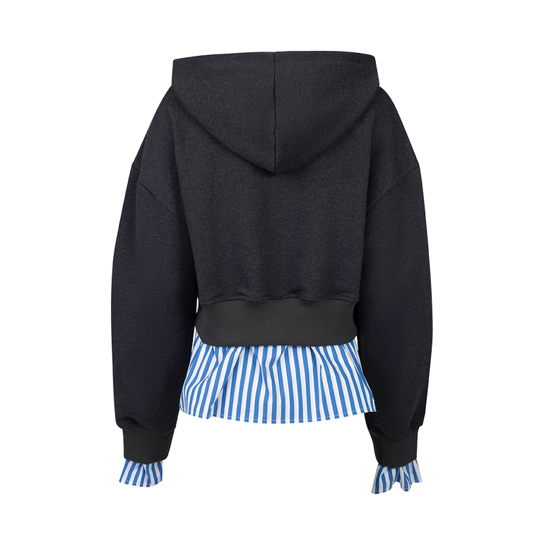 Hoodie in boxy silhouette with drawstring hood and layered shirt detail on hem and cuffs.