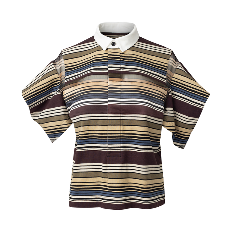 Polo shirt with spread collar, concealed four-button placket, sheer mesh panel at chest and shoulders, cutout at sleeves.