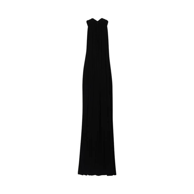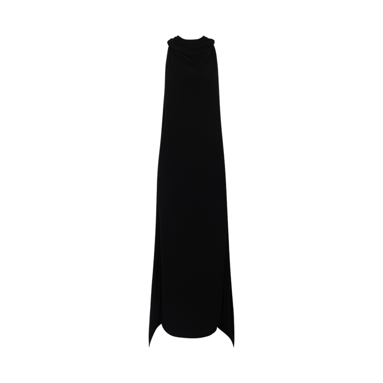 Sleeveless gown with cowl halter neck, cutaway shoulders, back drape, back vent and concealed back zip. Lined.