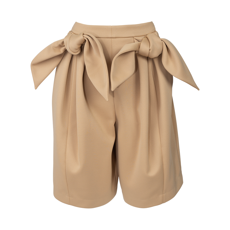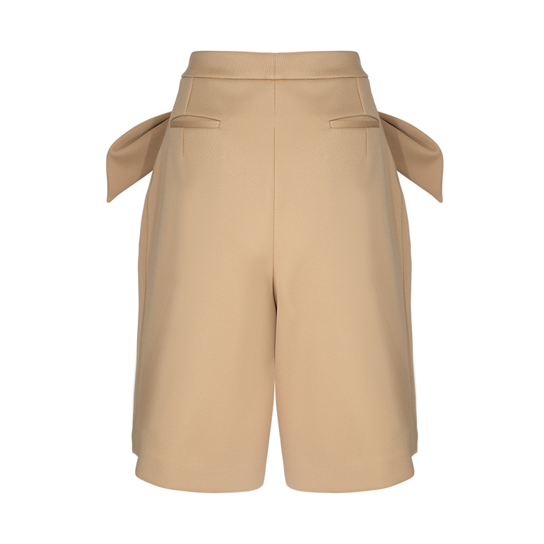 Knee-length shorts in boxy fit with high rise, detachable bows, concealed side pockets and back welt pockets.